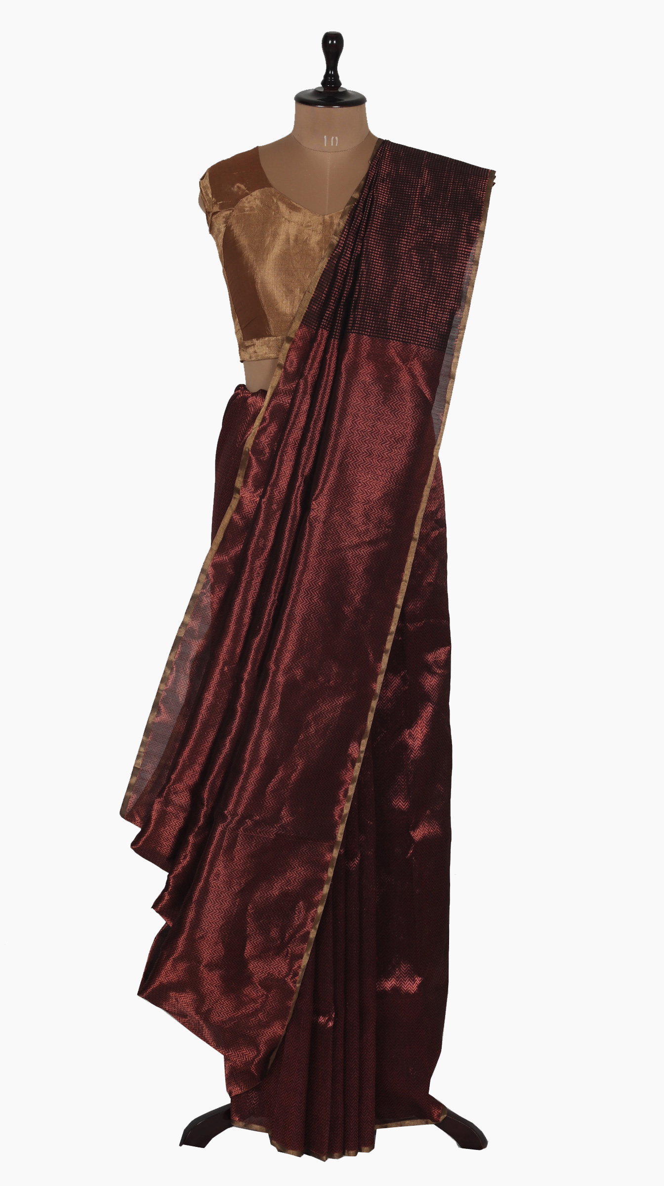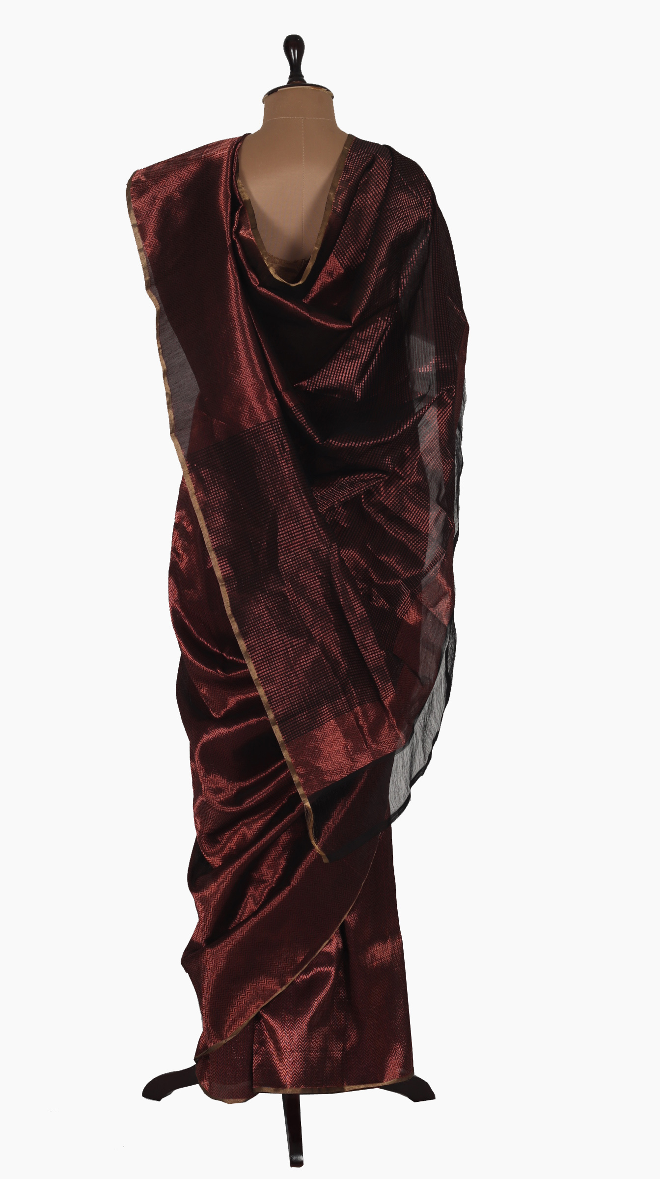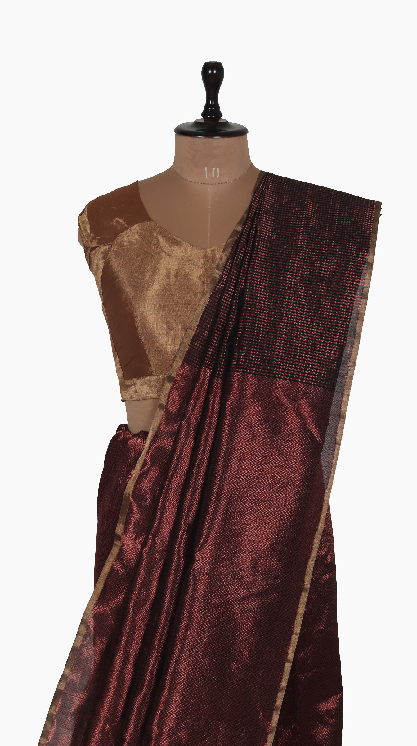 Copper Zigzag Chanderi Saree with copper zari zigzag design in complete body with extra weft stripe pallu.