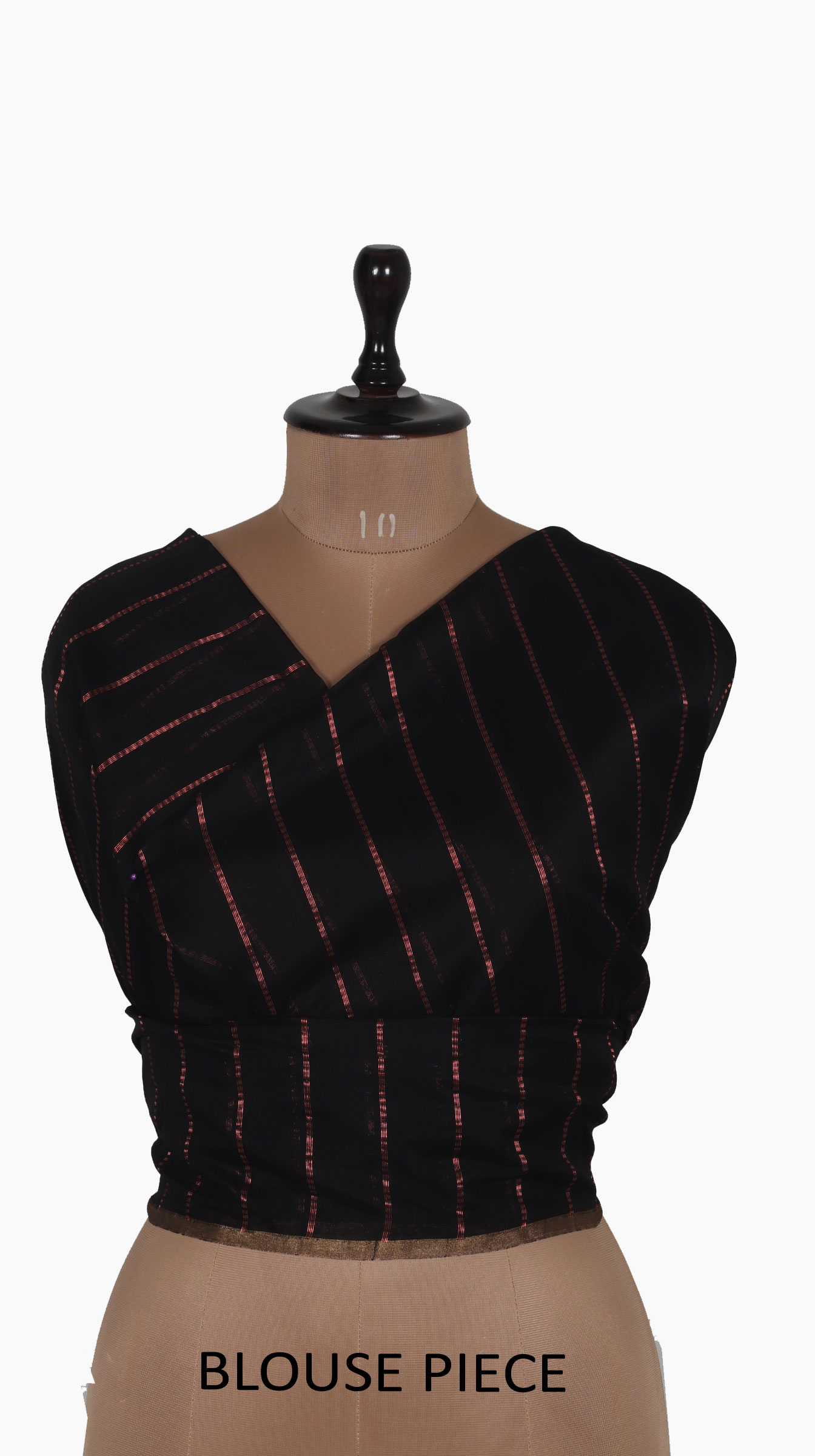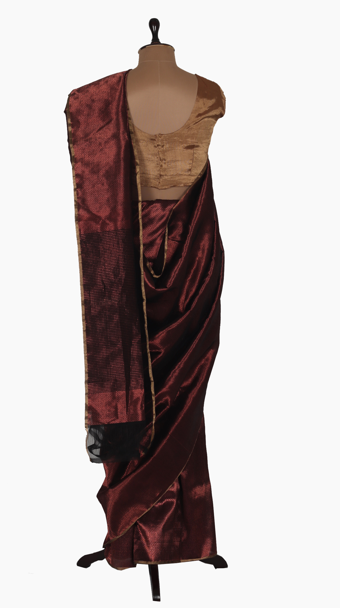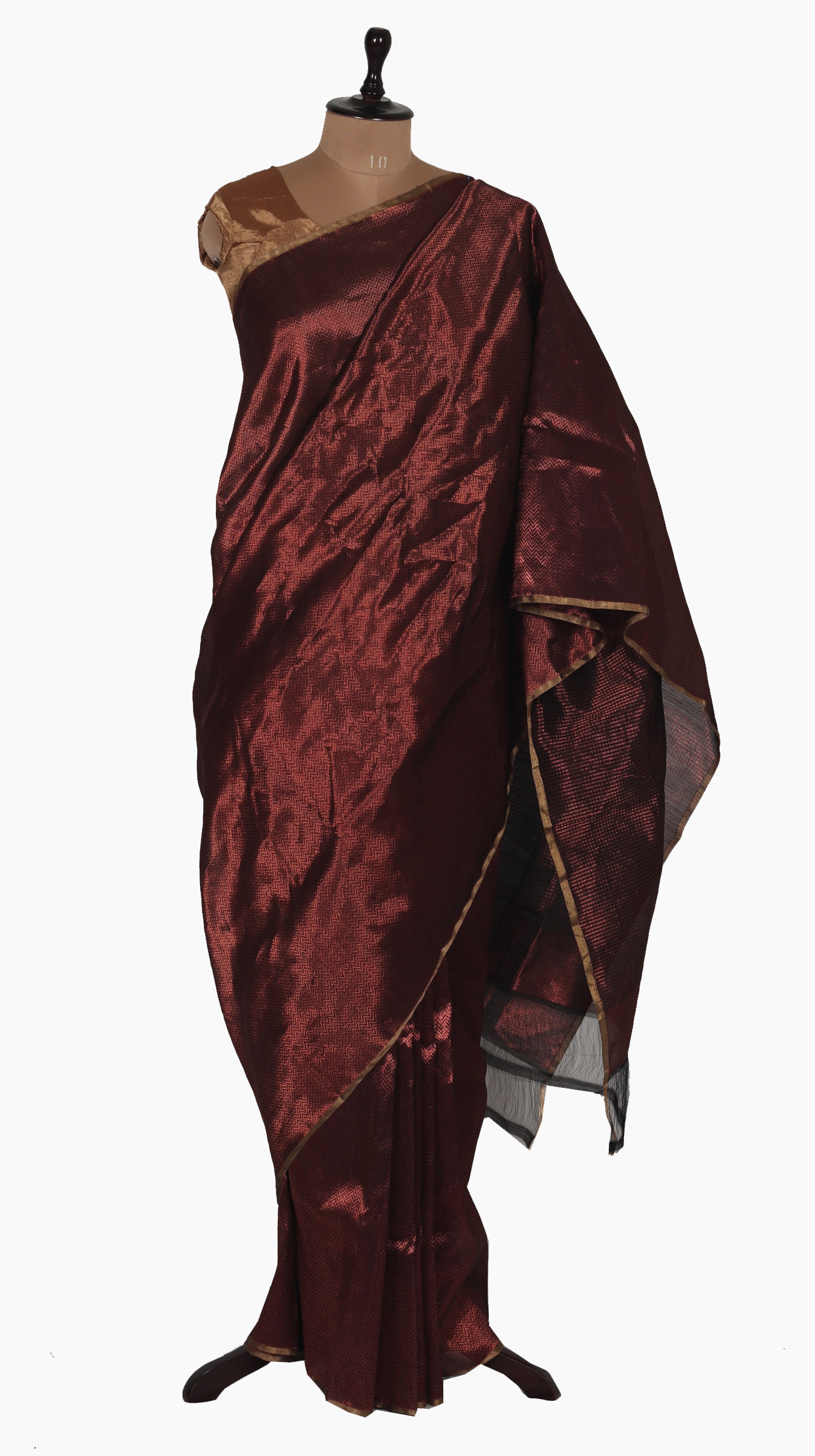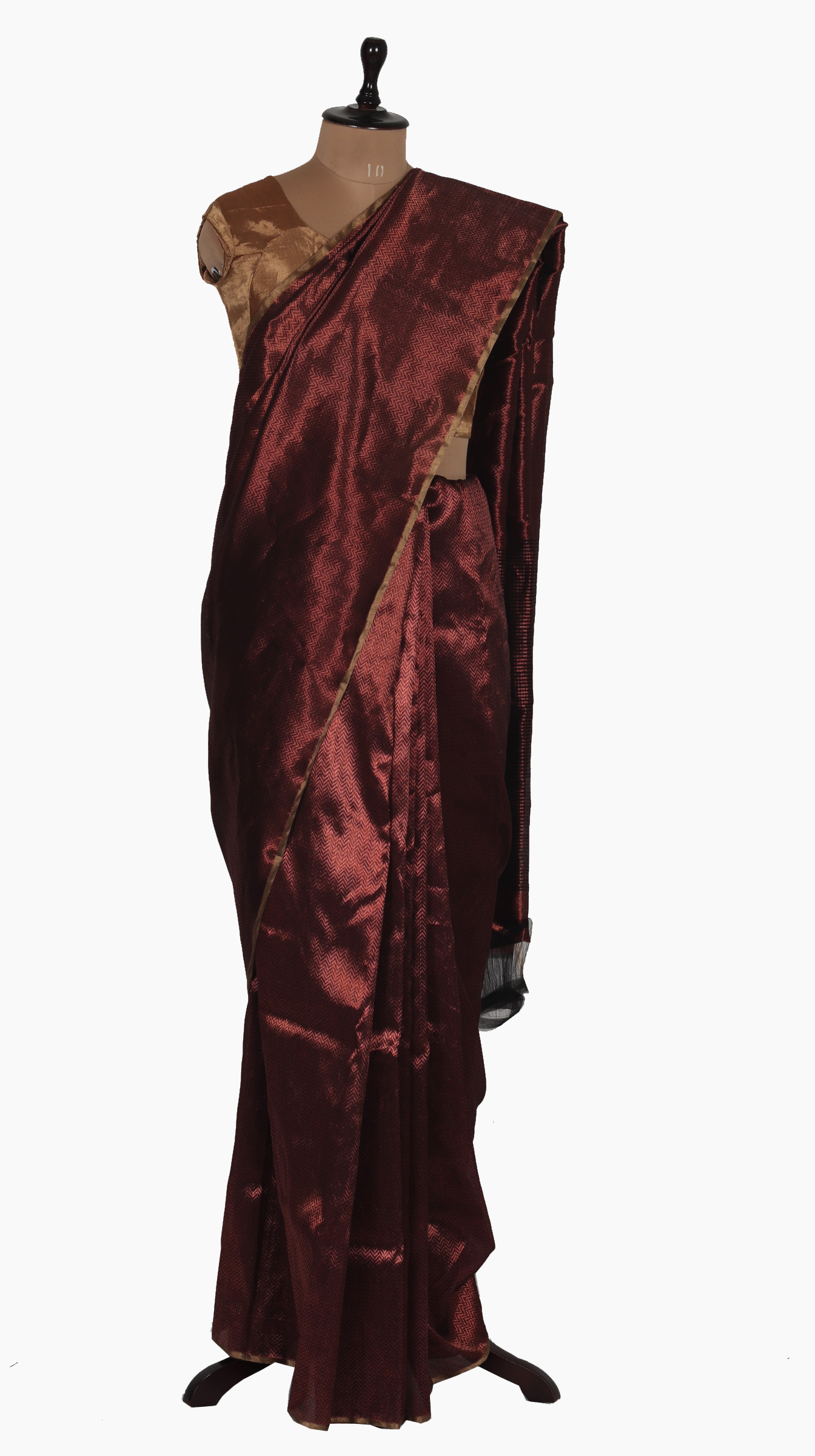 Copper Zigzag Chanderi Saree with copper zari zigzag design in complete body with extra weft stripe pallu.