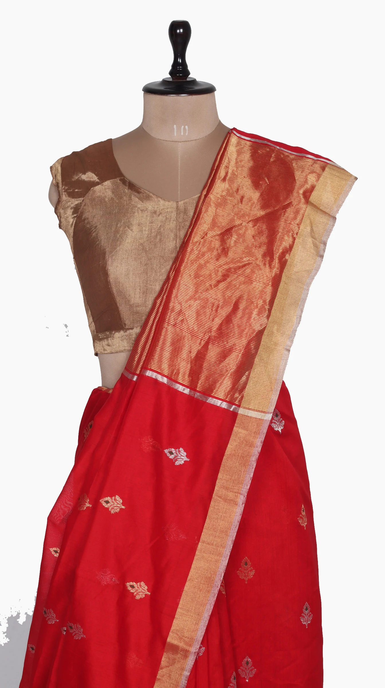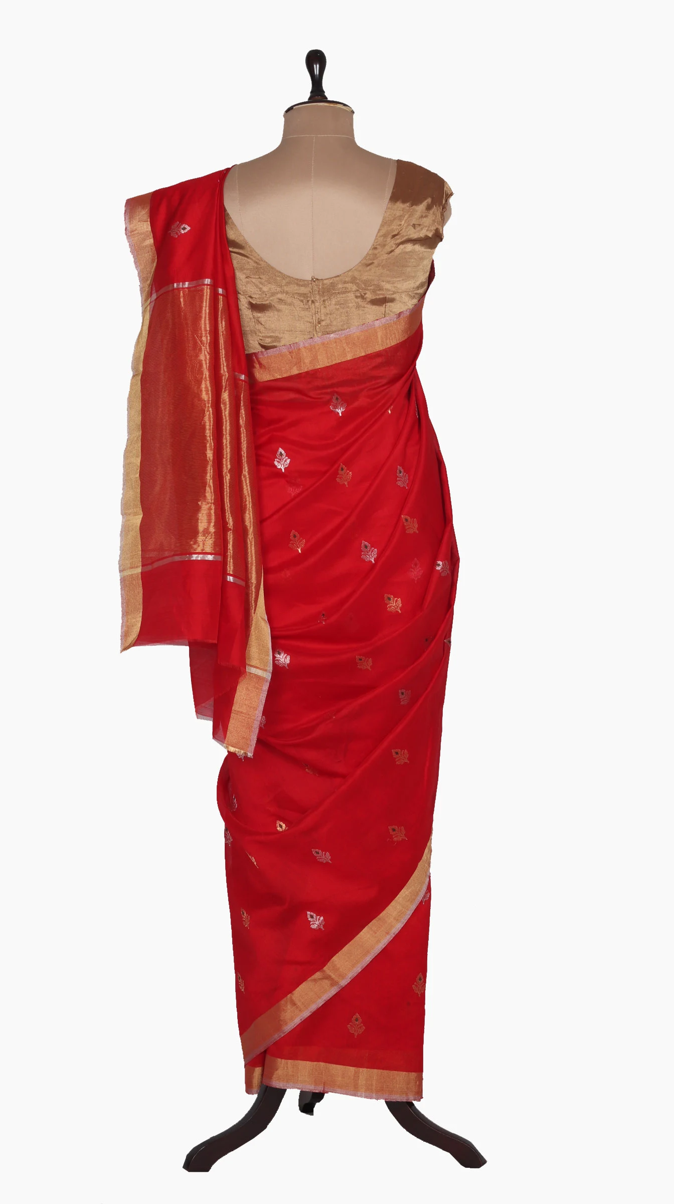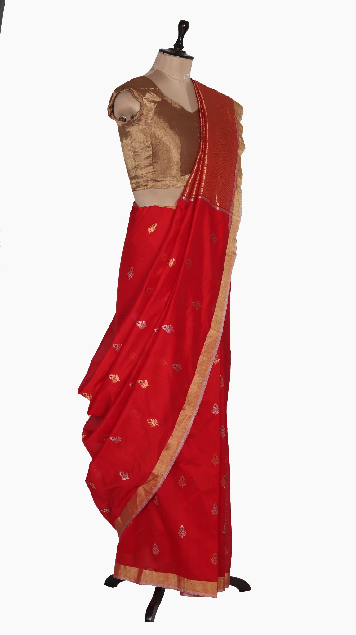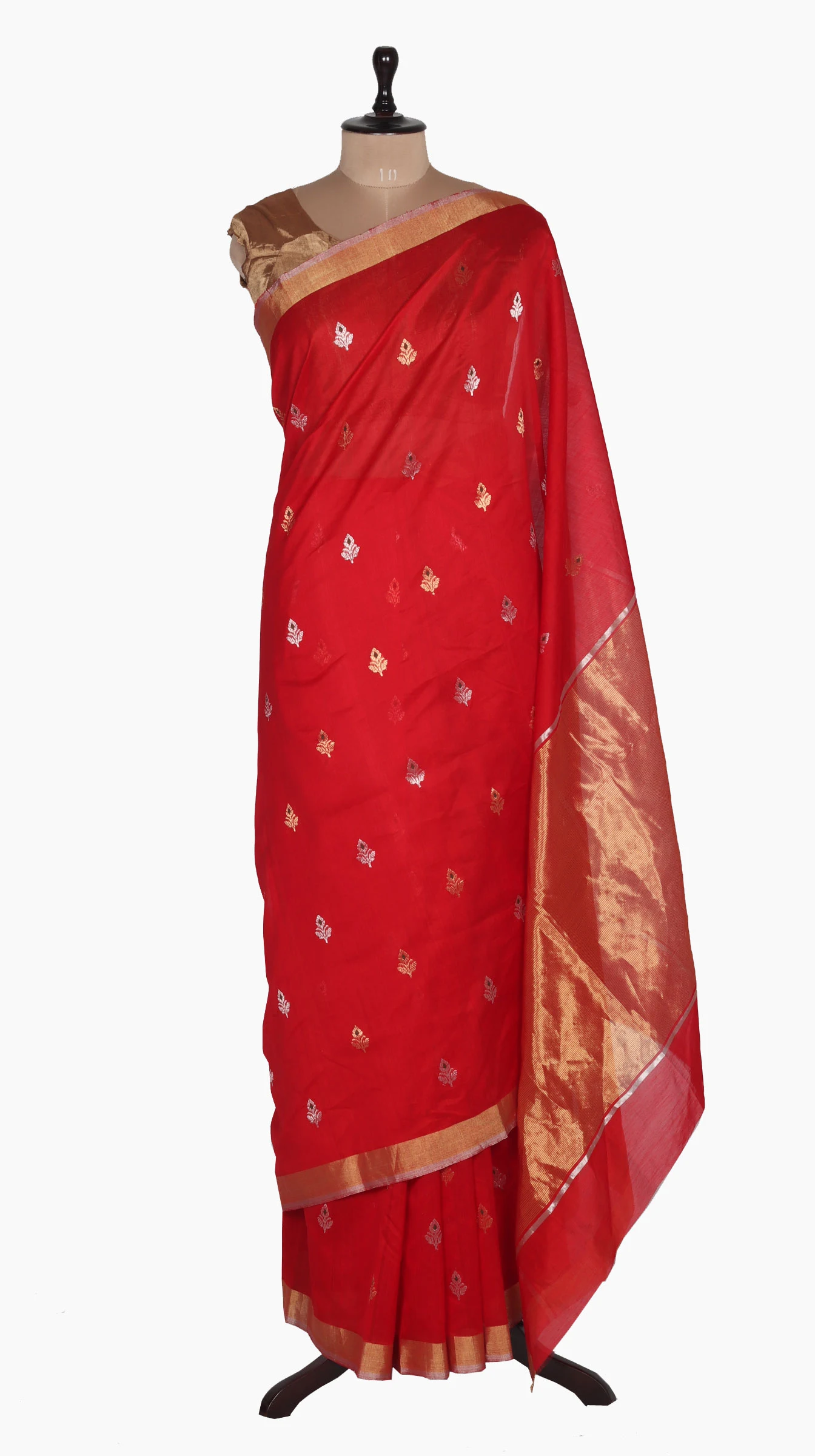 Golden Silver Meena Buta Red Chanderi Saree with Golden Jari stripe Pallu