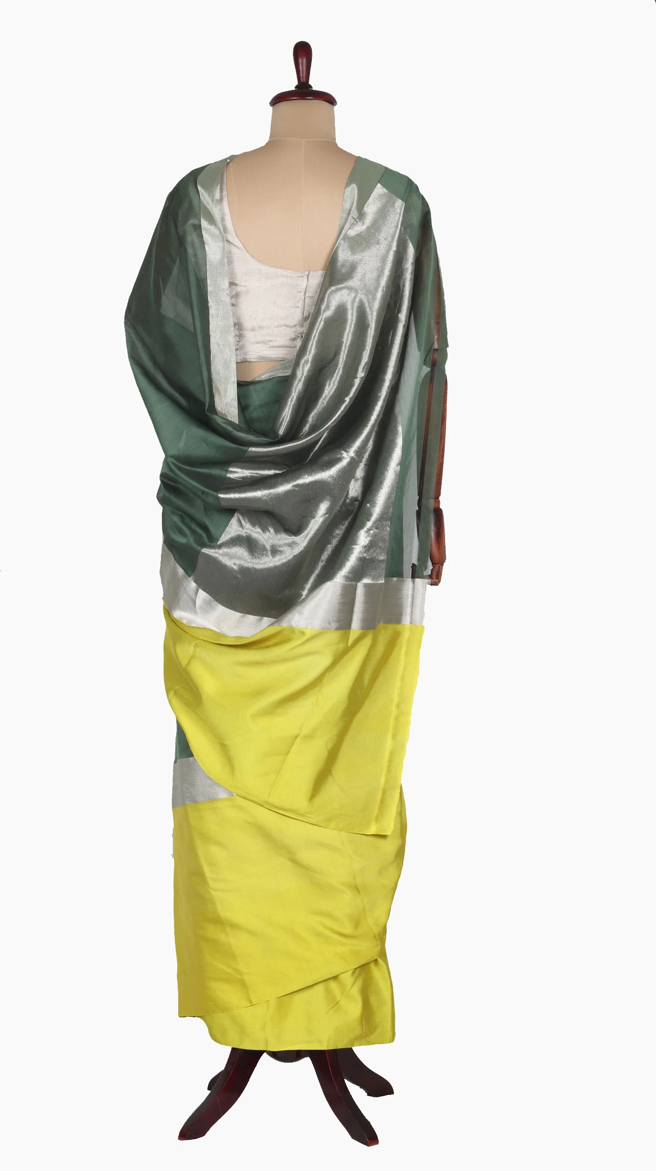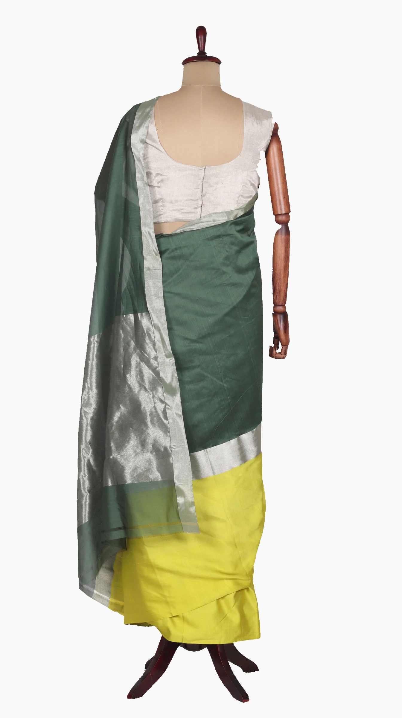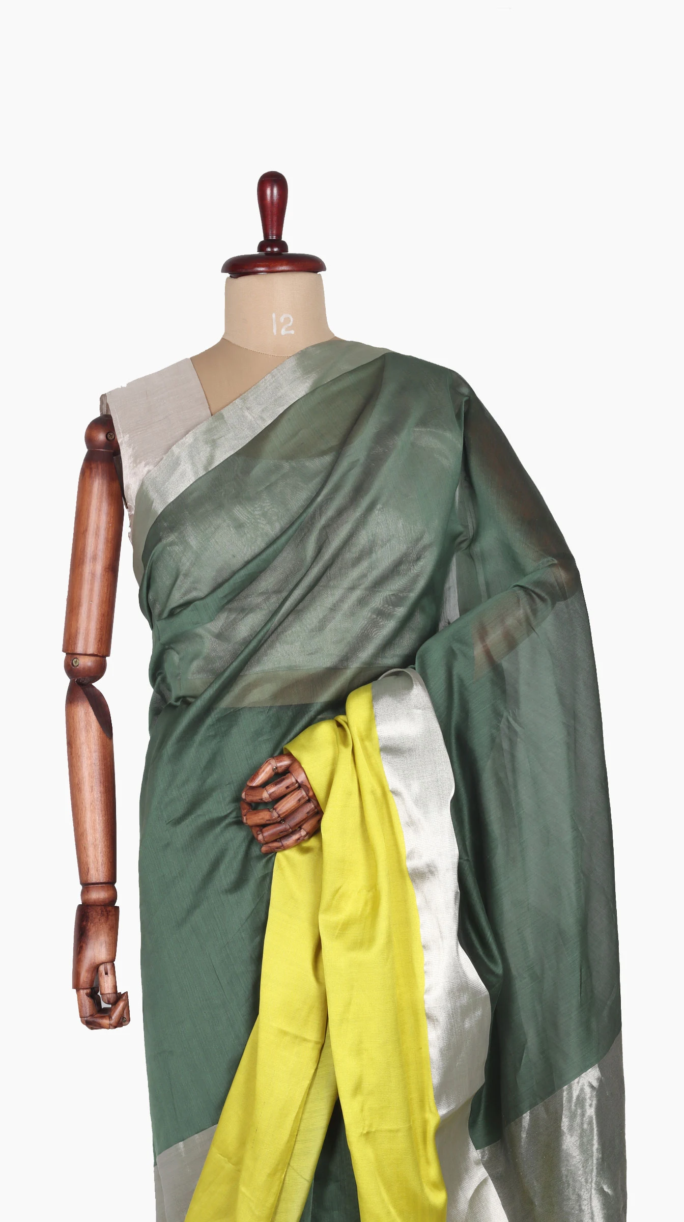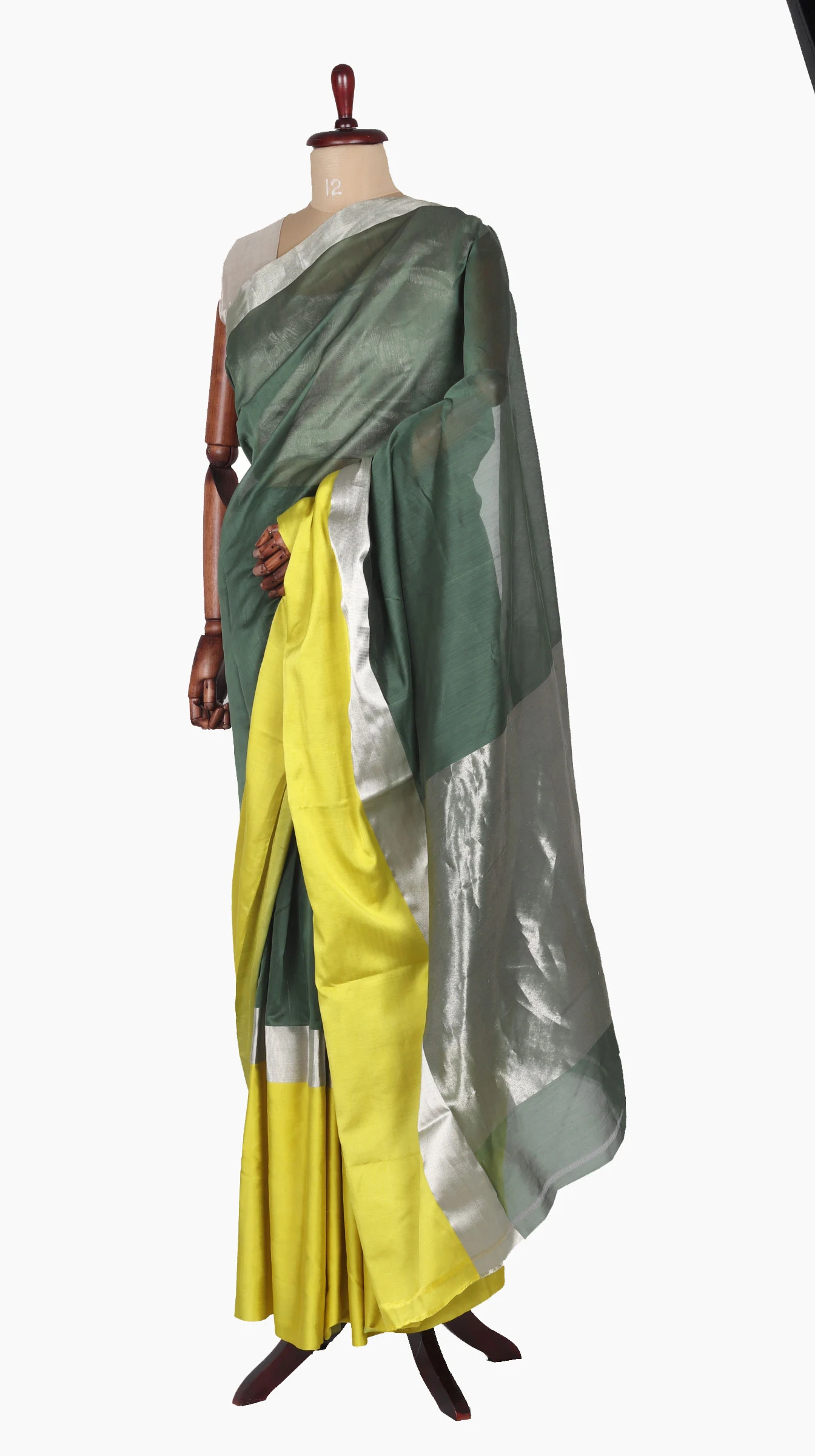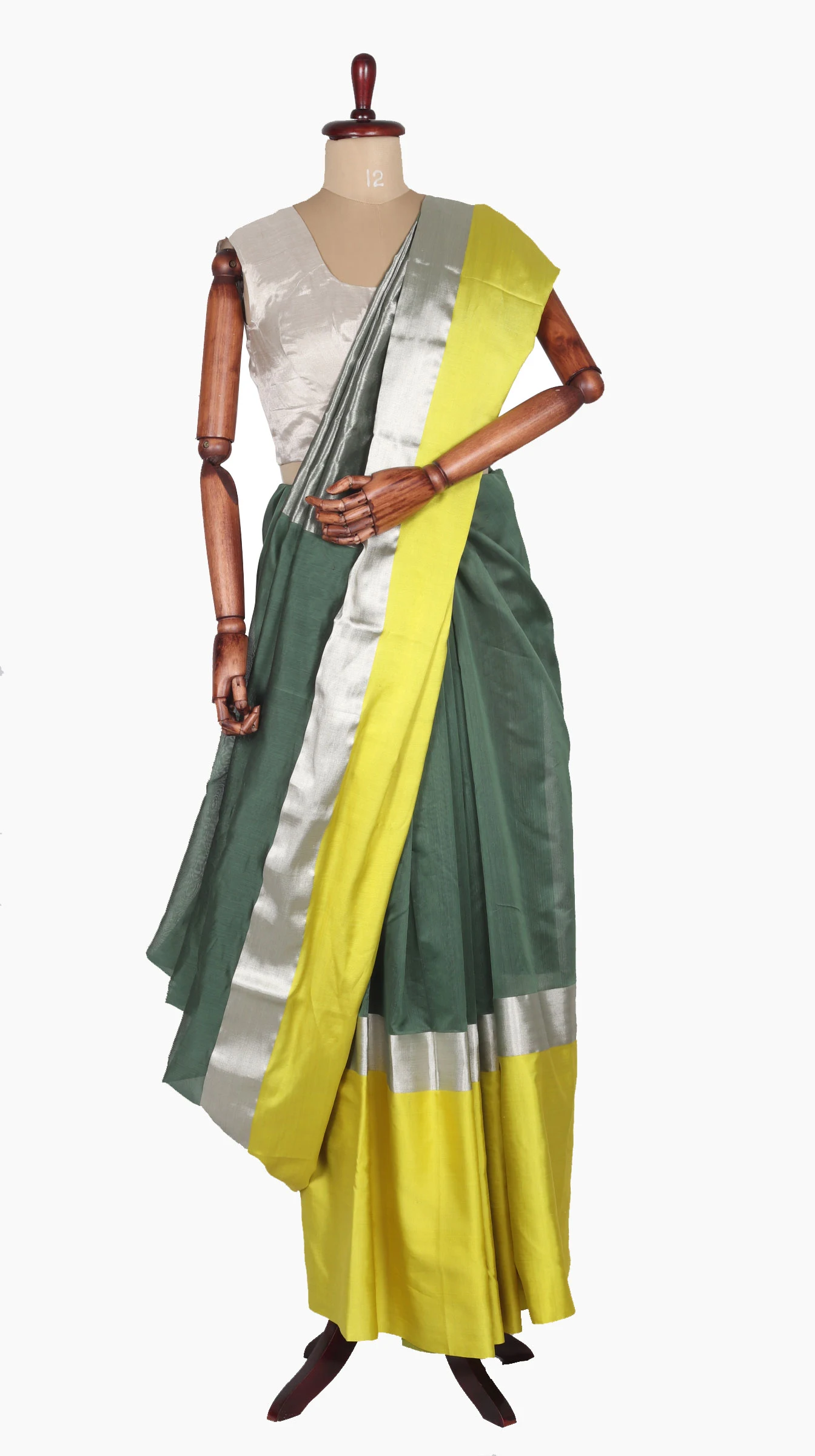 Mashru Silk Lemon Border saree and silver zari band with chanderi silk green body along with Silver zari Solid Taraz Weave Pallu.