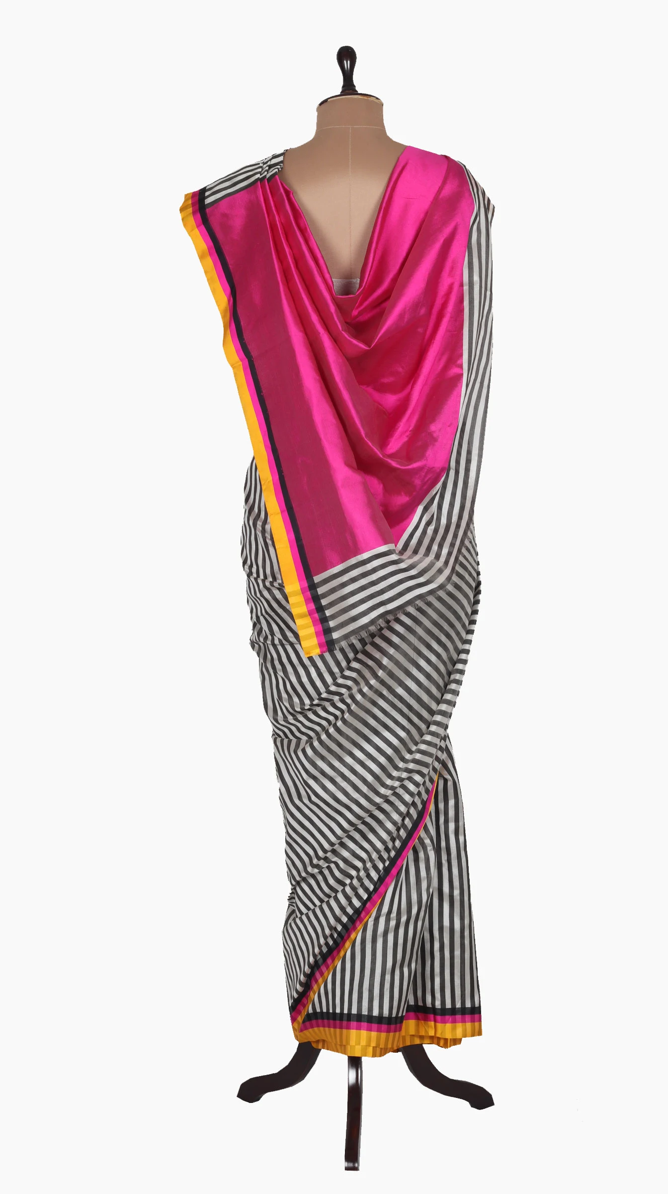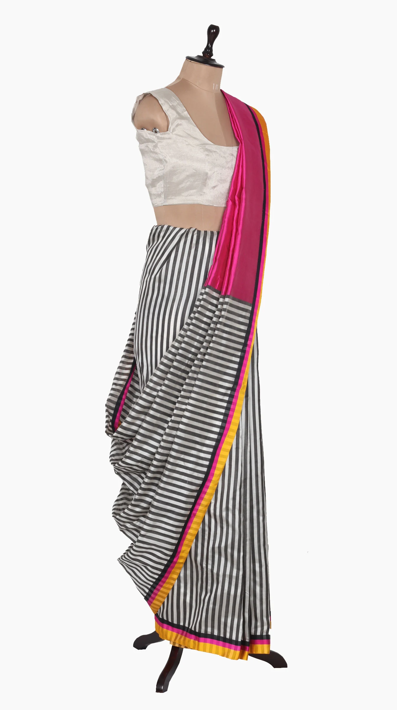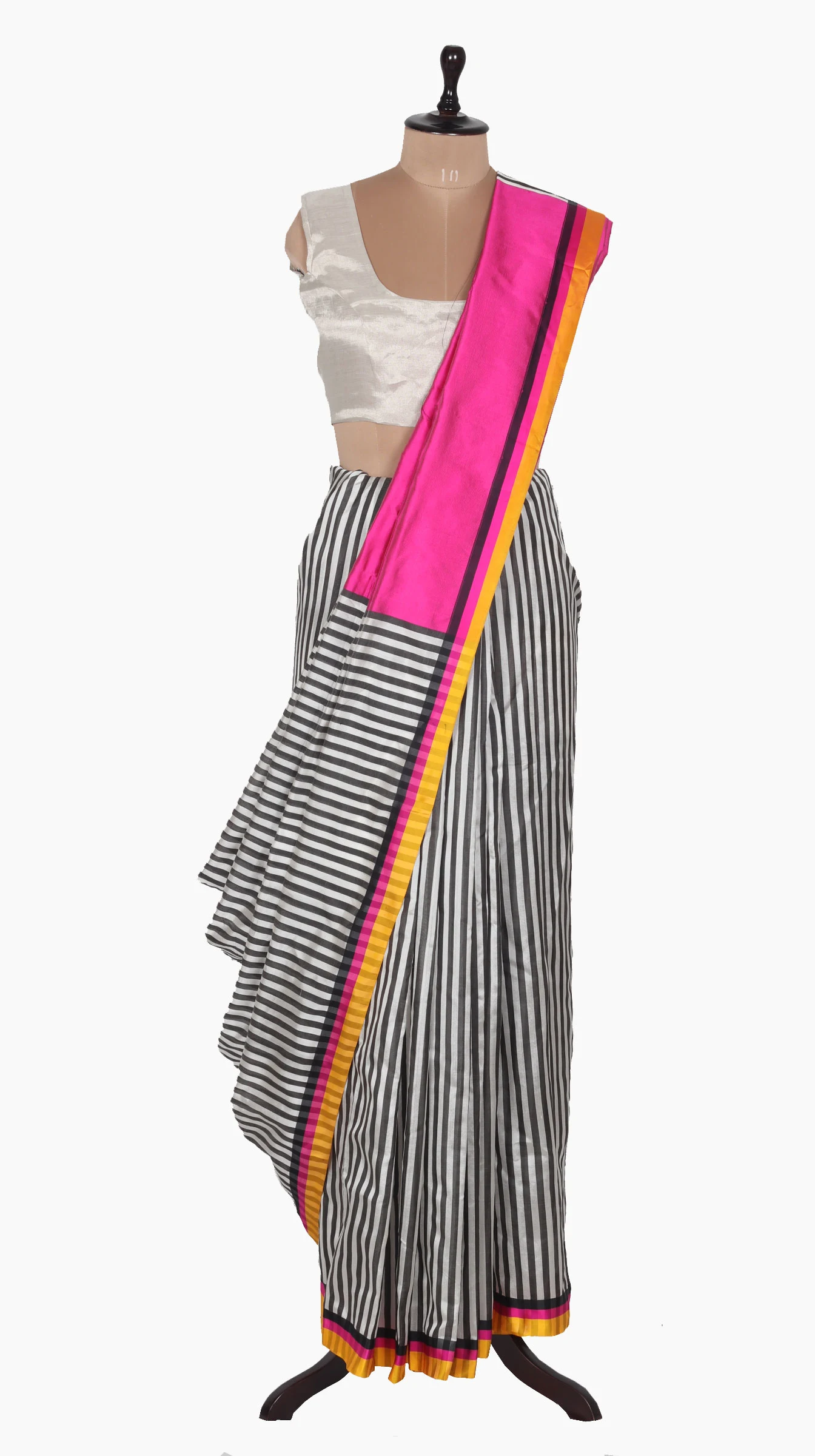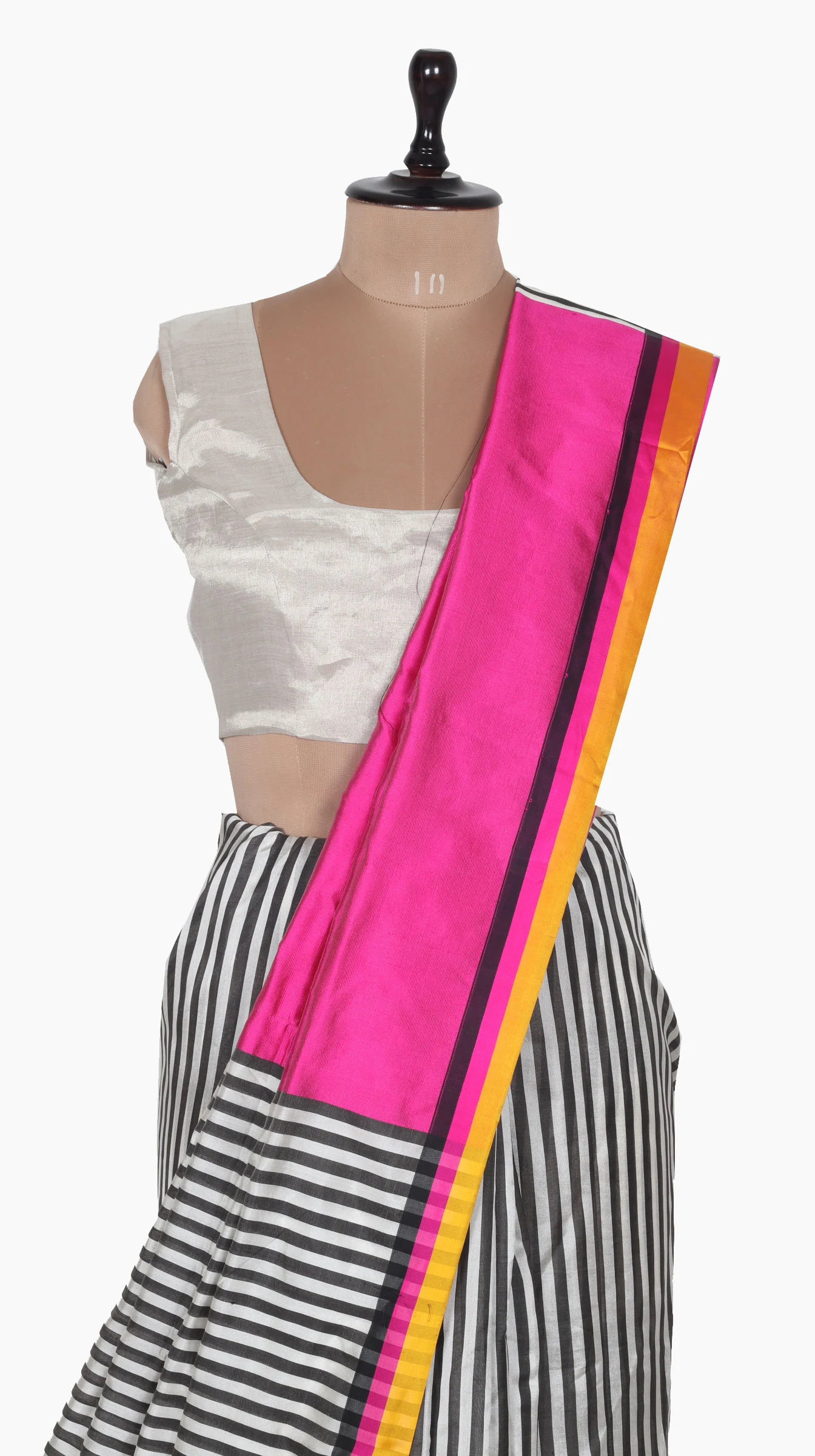 Mashru Black & White Stripe Chanderi Soft SilkĀ Saree with Contrast Raani Pink Pallu