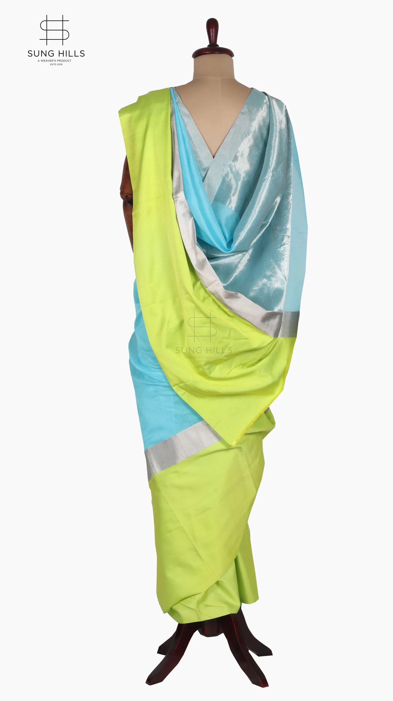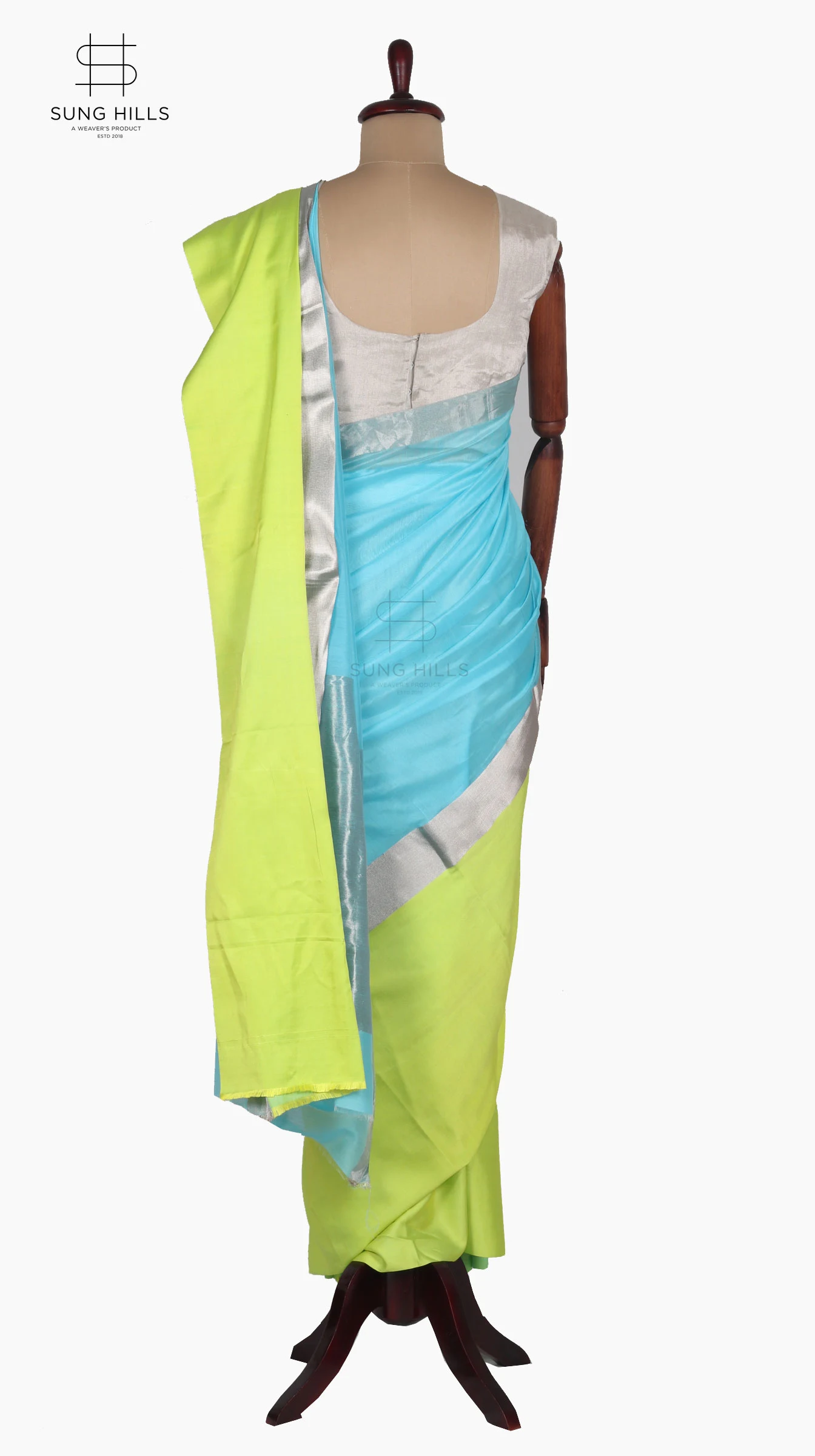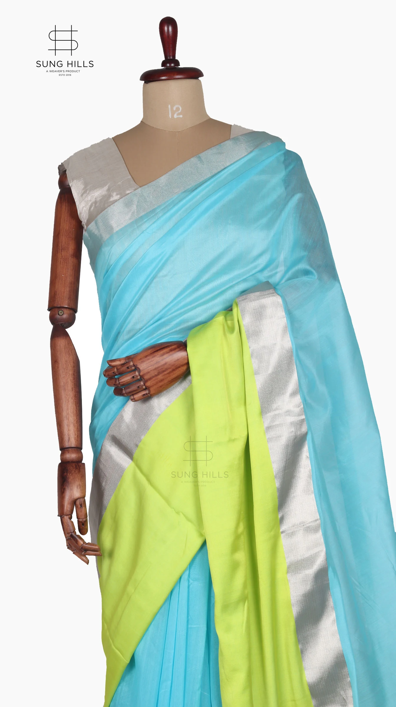 Mashru Lemon Yellow Border Saree with Silver zari Band in complete Plain Sky Blue body along with Silver Zari Taraz Weave Solid Pallu.