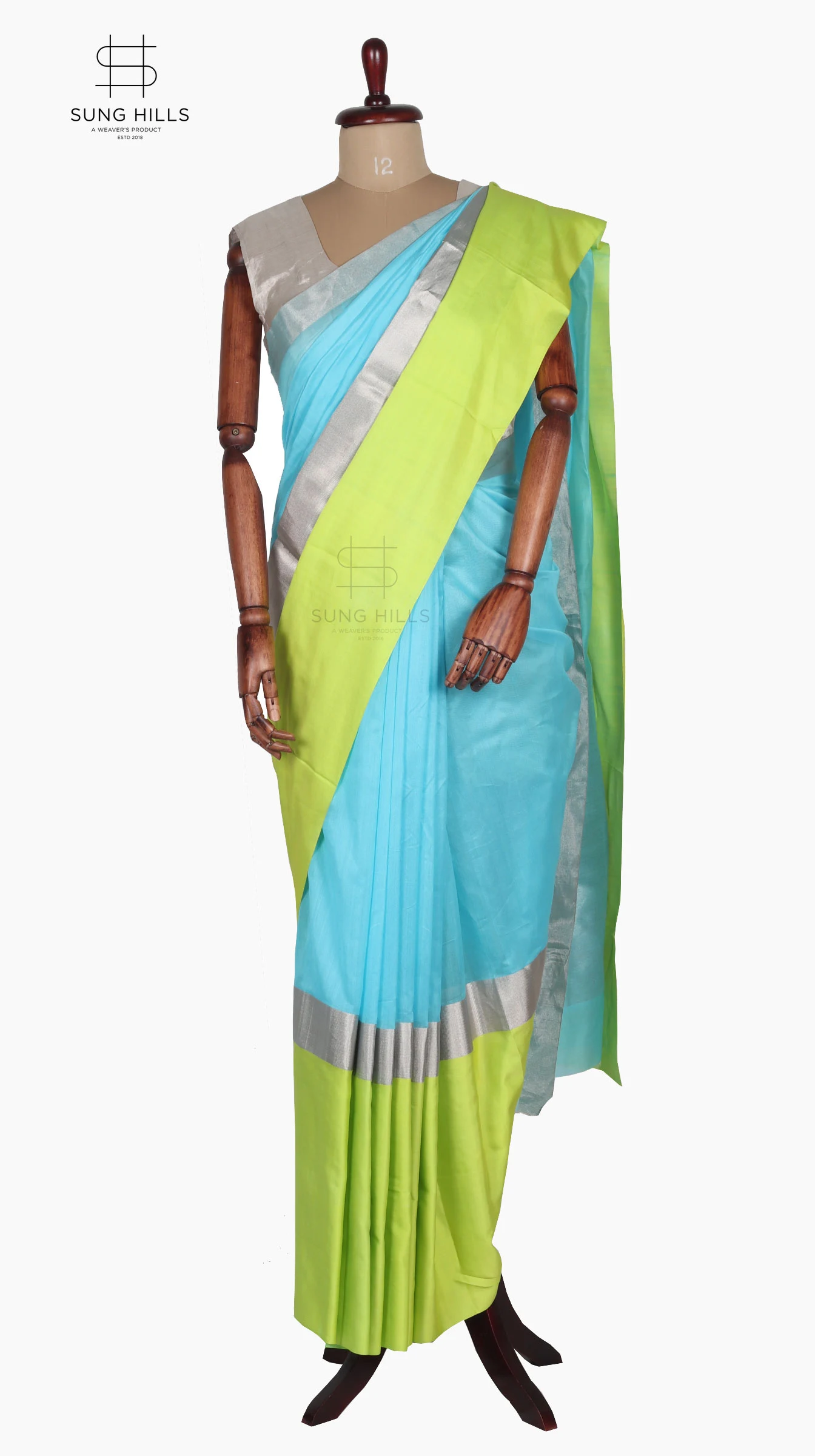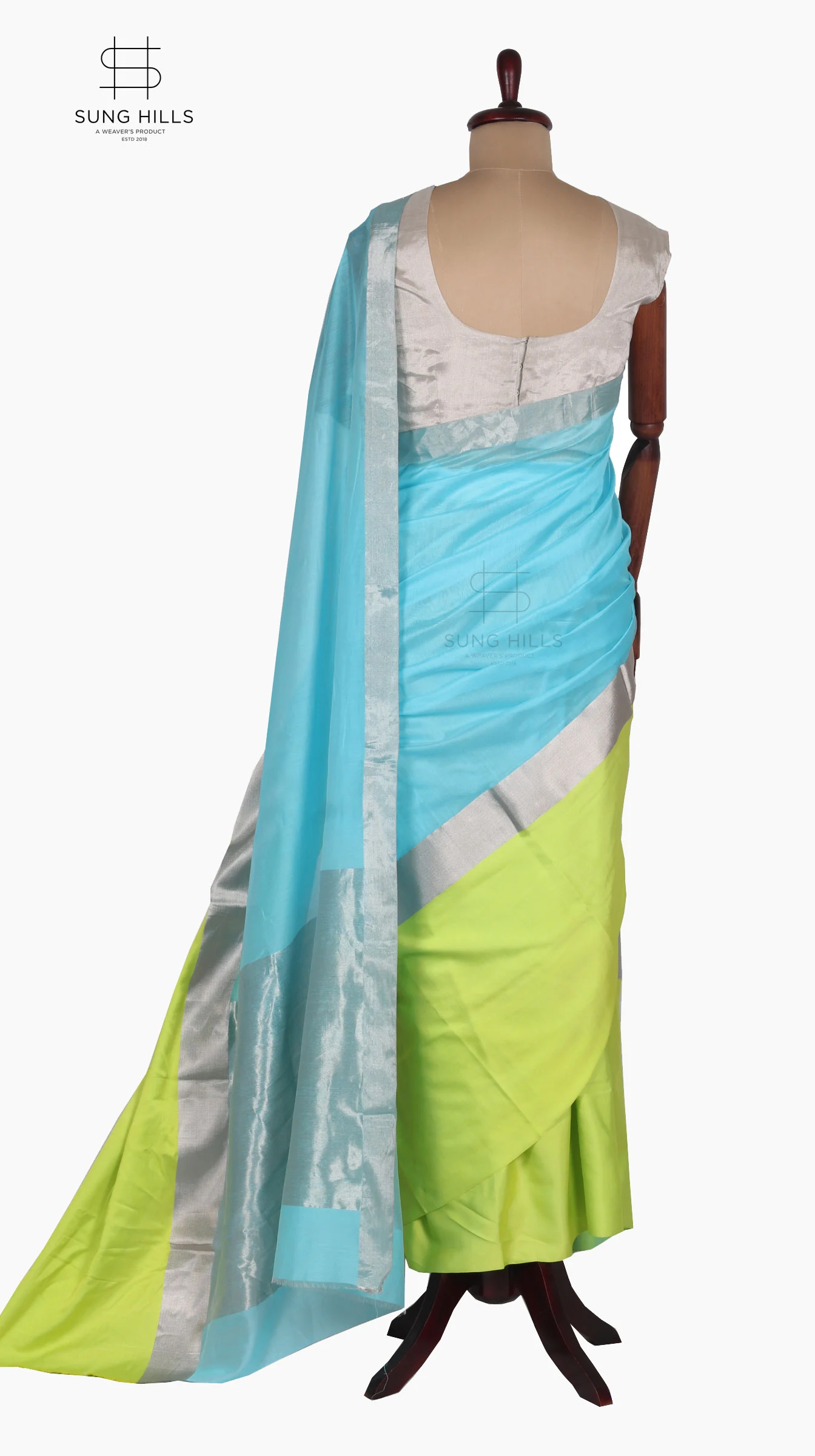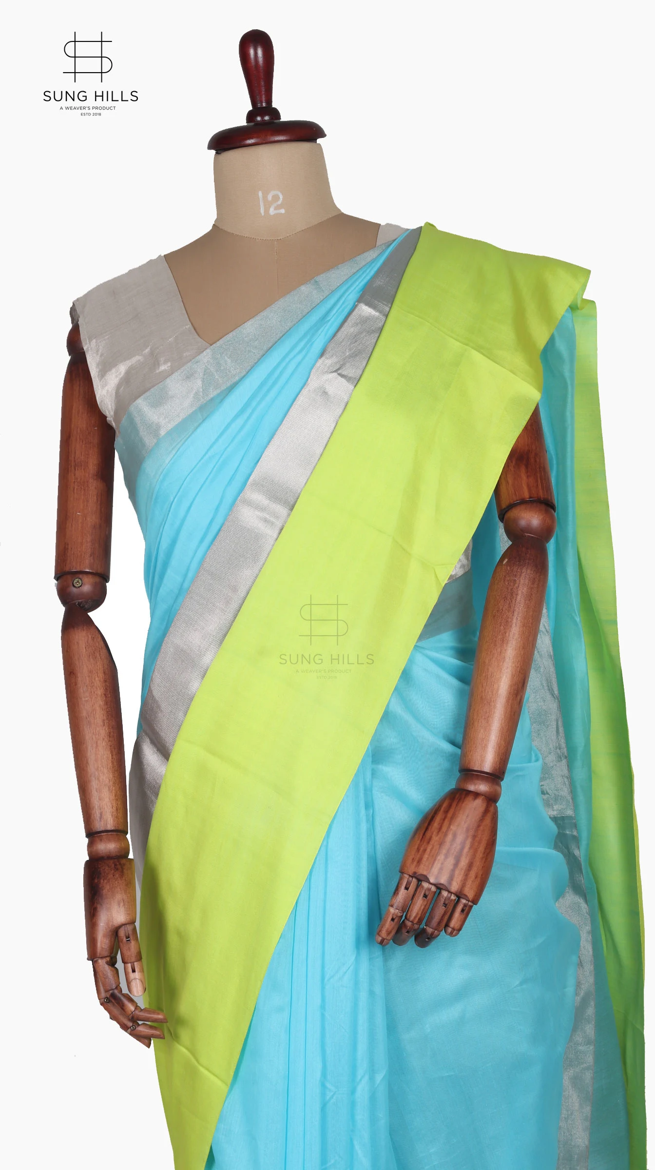 Mashru Lemon Yellow Border Saree with Silver zari Band in complete Plain Sky Blue body along with Silver Zari Taraz Weave Solid Pallu.