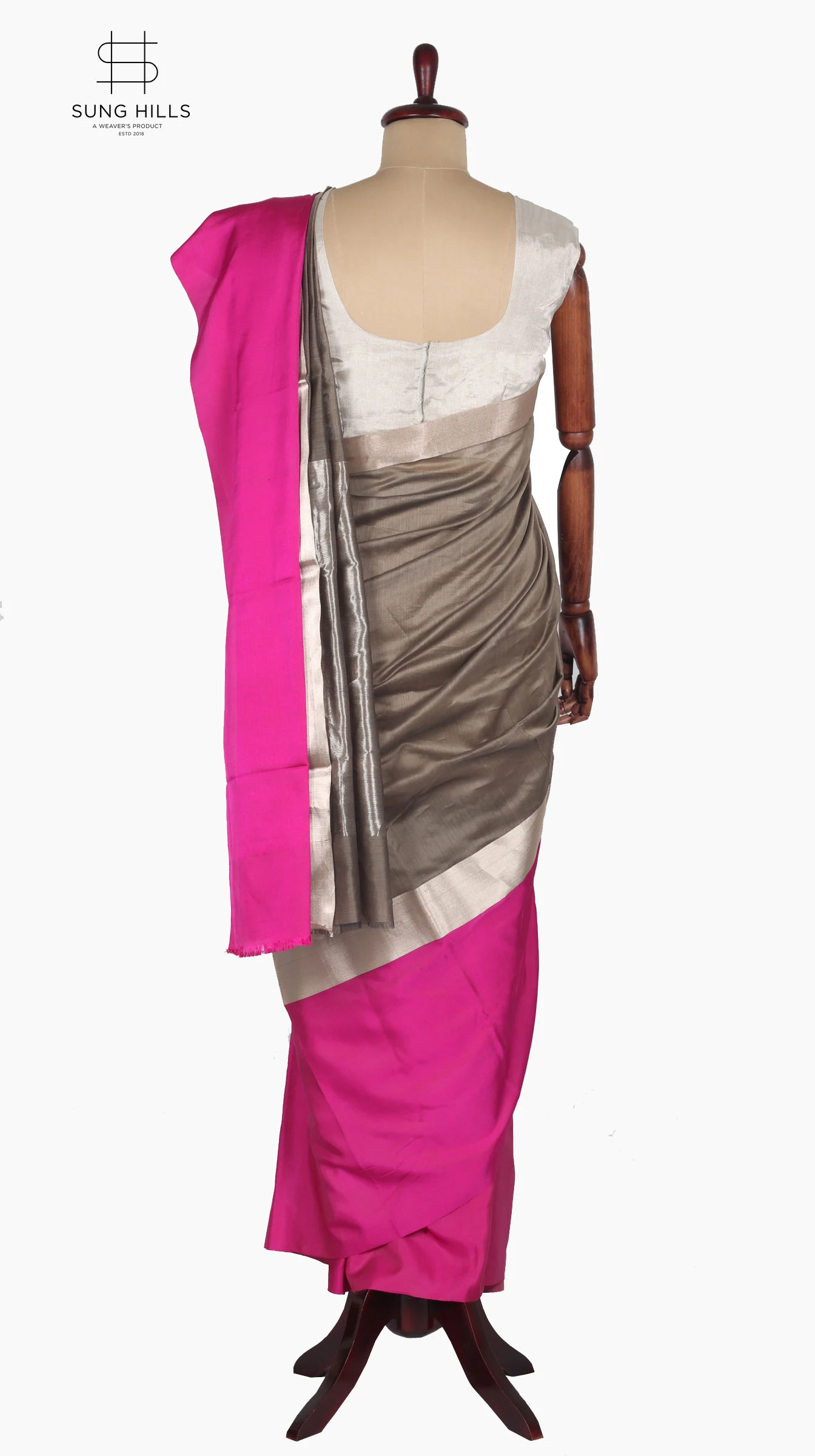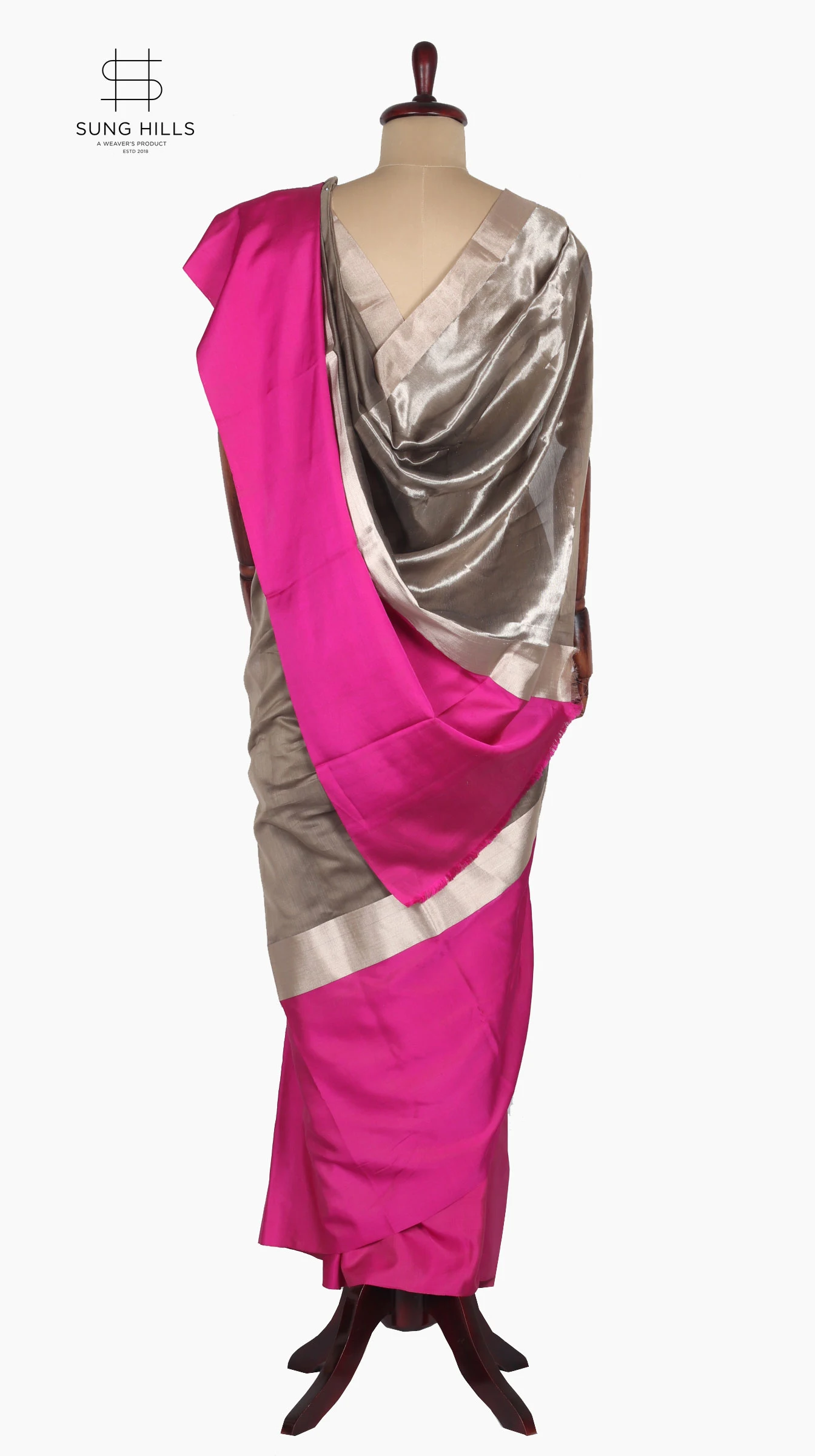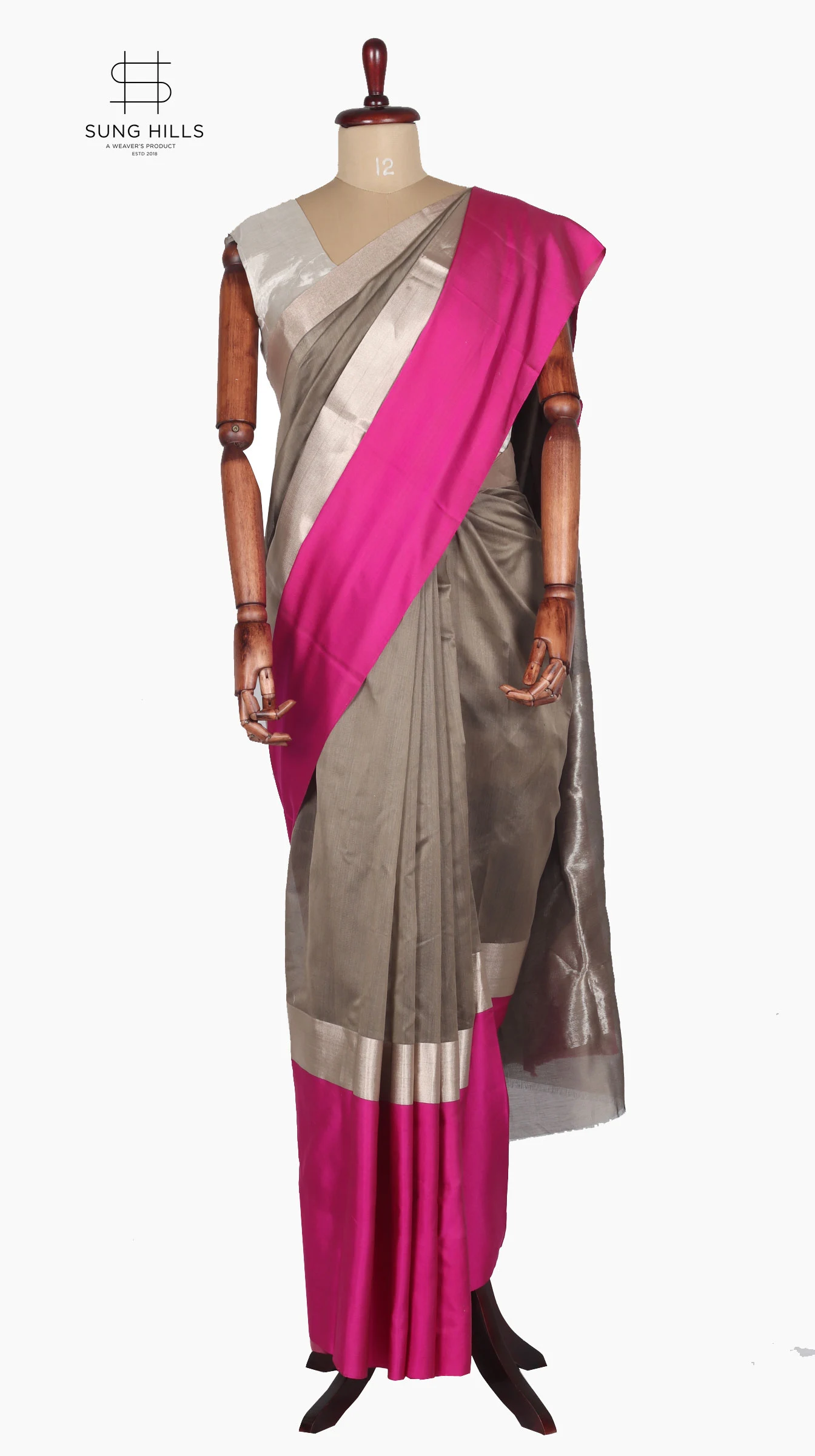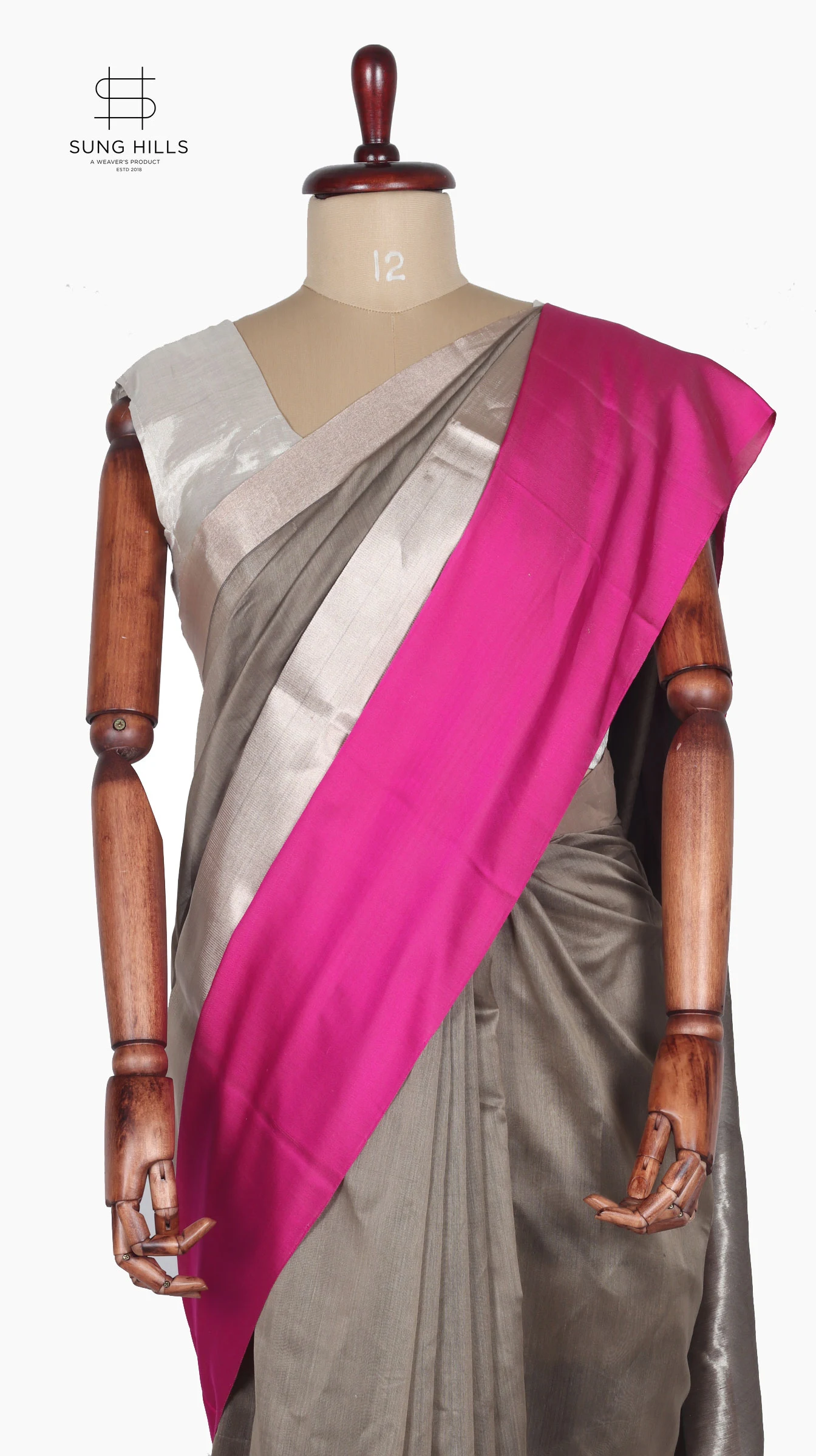 Mashru Silk Raani Border Saree and silver zari band with Plain chanderi silk Beige body along with Silver zari Solid Taraz Weave Pallu.