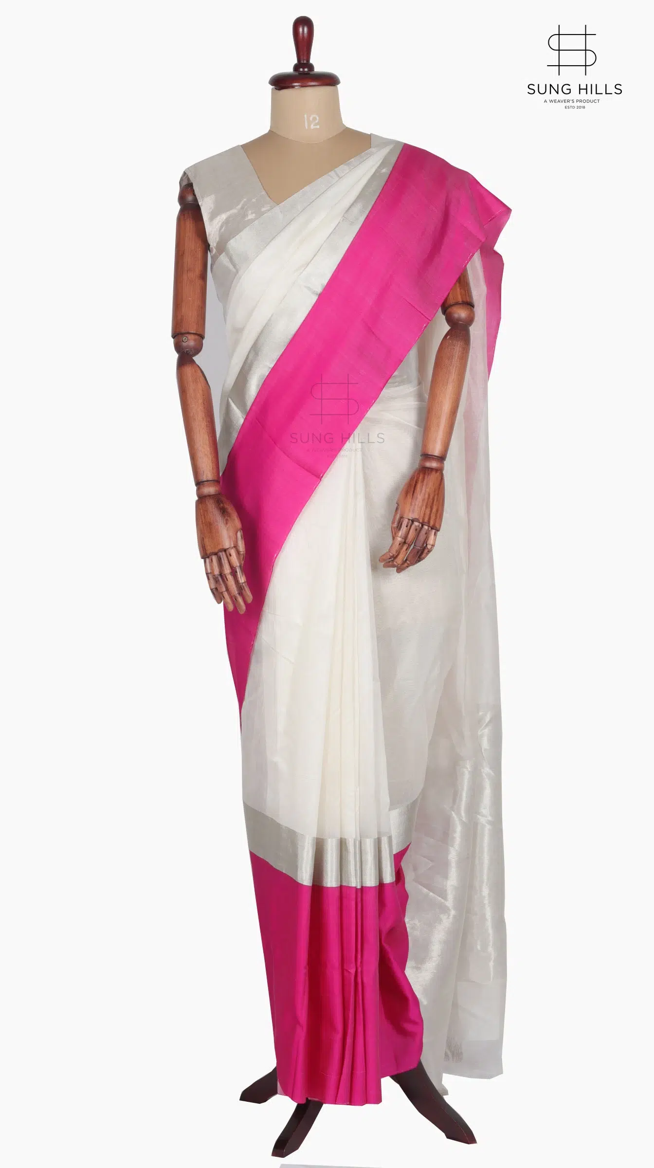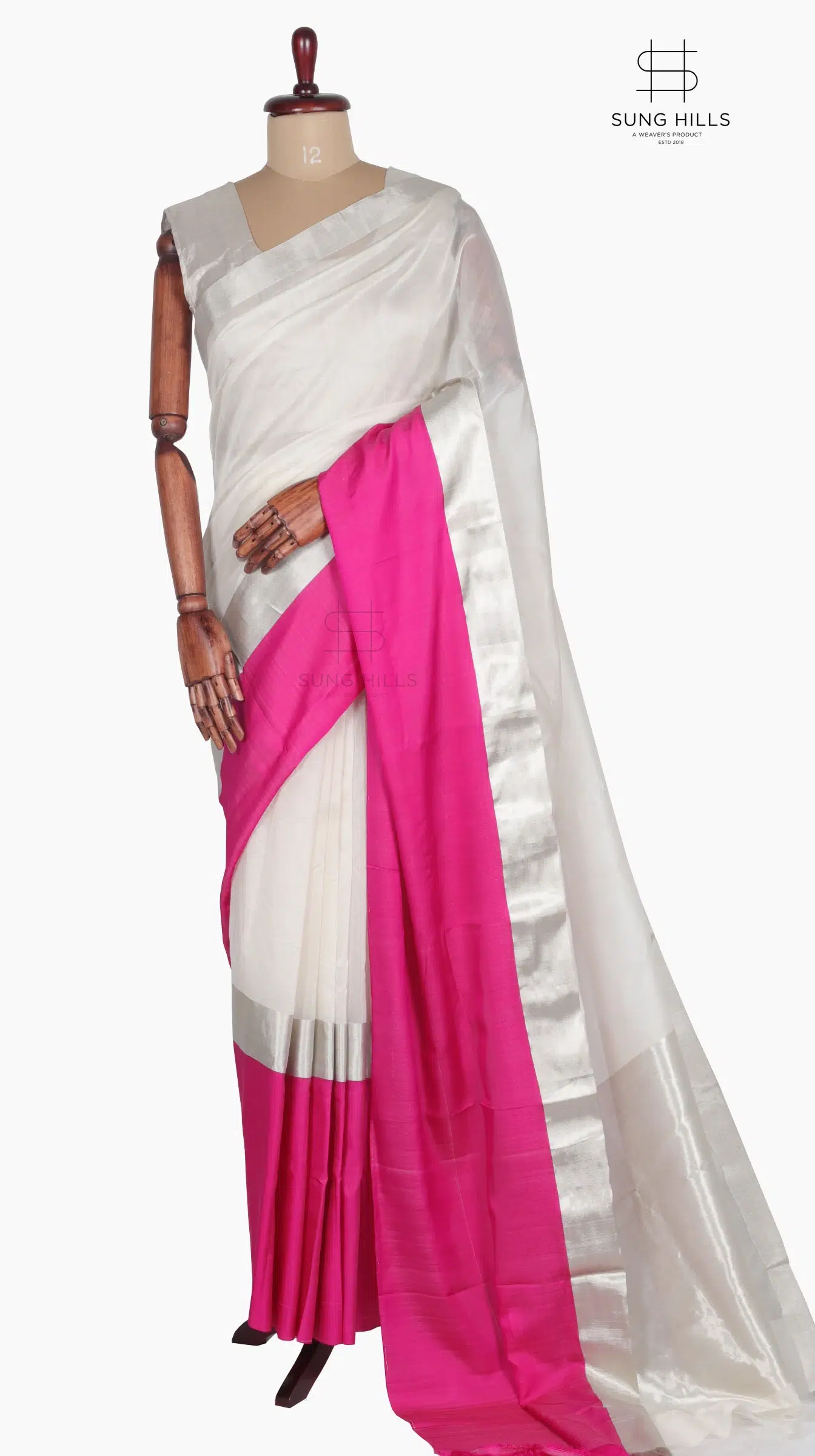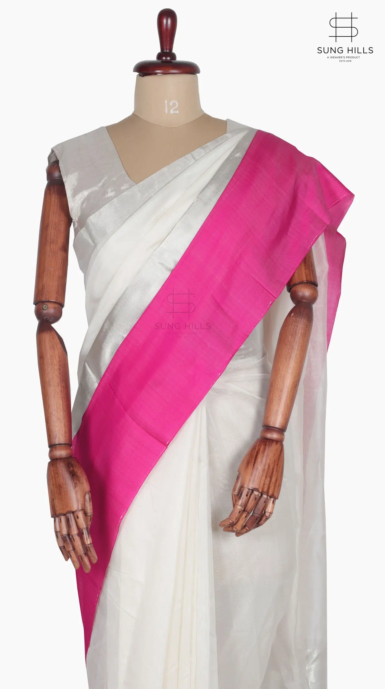 Mashru Raani Pink Border with Silver zari Band in complete Plain Off-white body along with Silver Zari Taraz Weave Solid Pallu.
