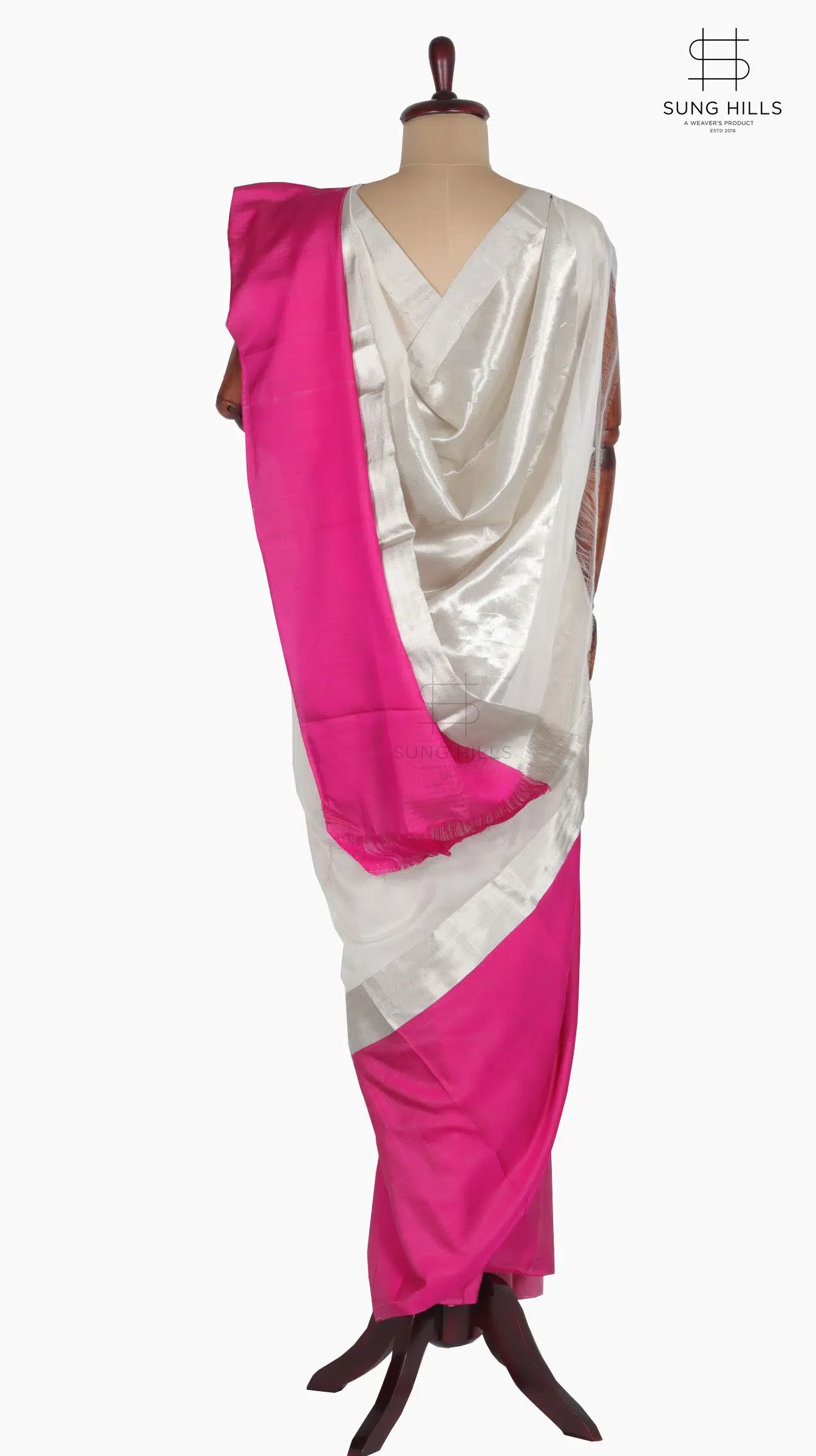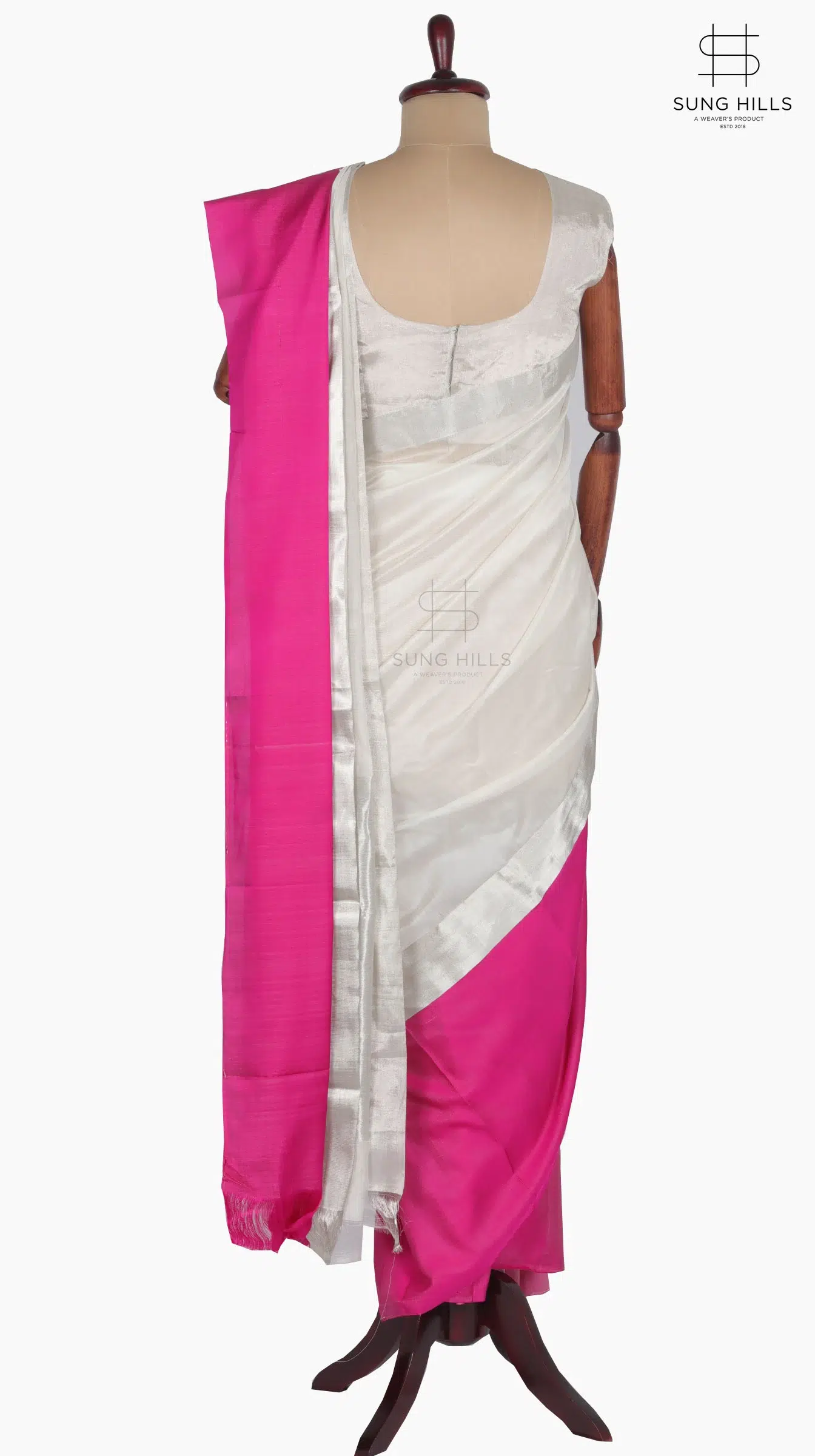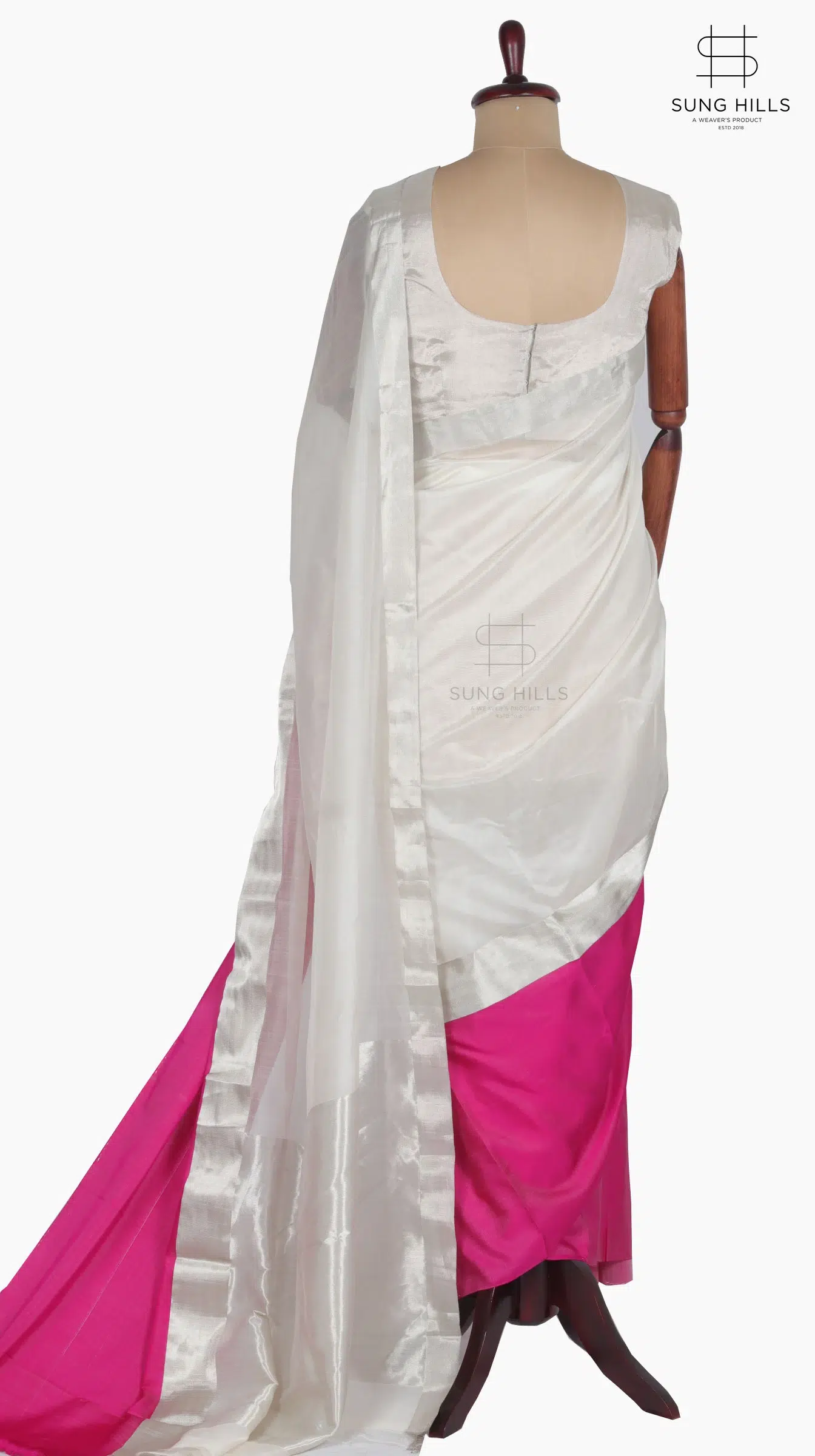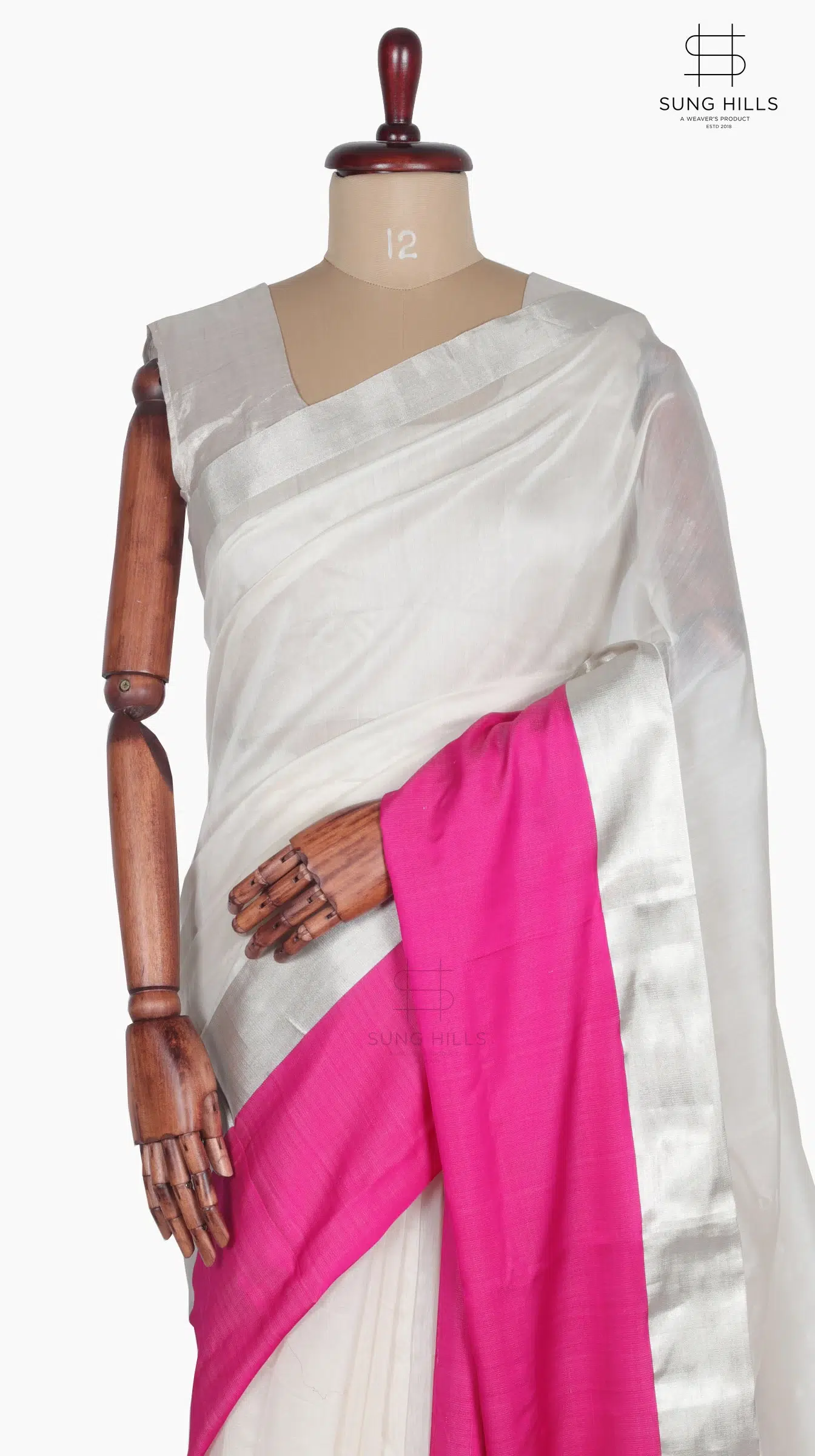 Mashru Raani Pink Border with Silver zari Band in complete Plain Off-white body along with Silver Zari Taraz Weave Solid Pallu.