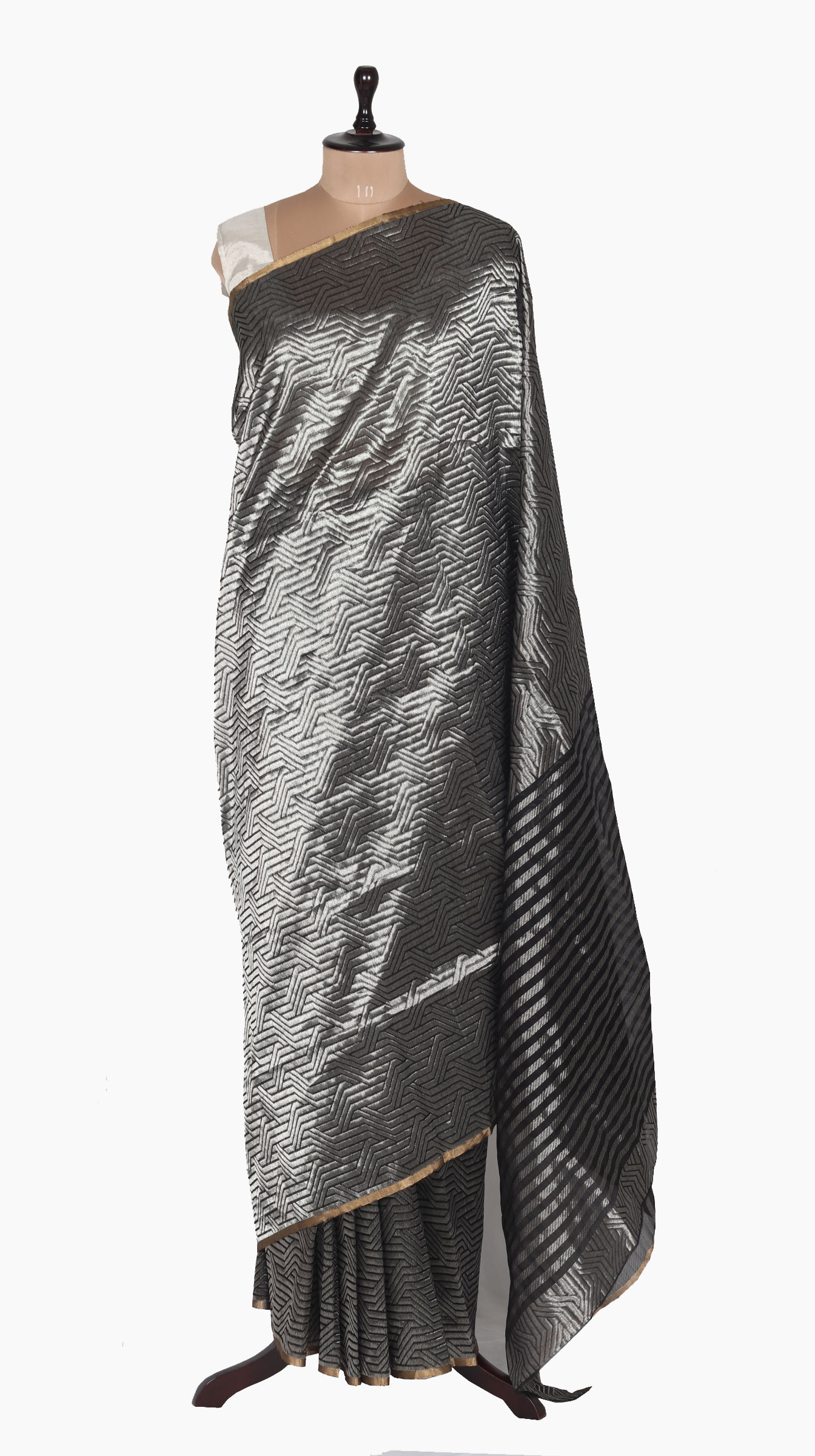 Up down Geometry Pattern work with Self Silver zari with same silver zari thin stripe pallu along with same thin stripe Blouse Chanderi Silk Saree.