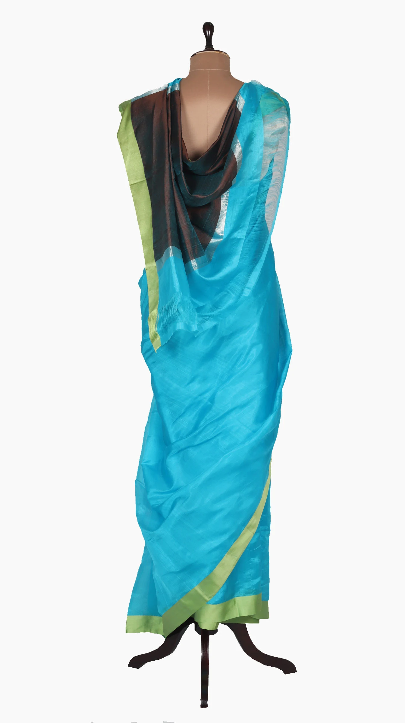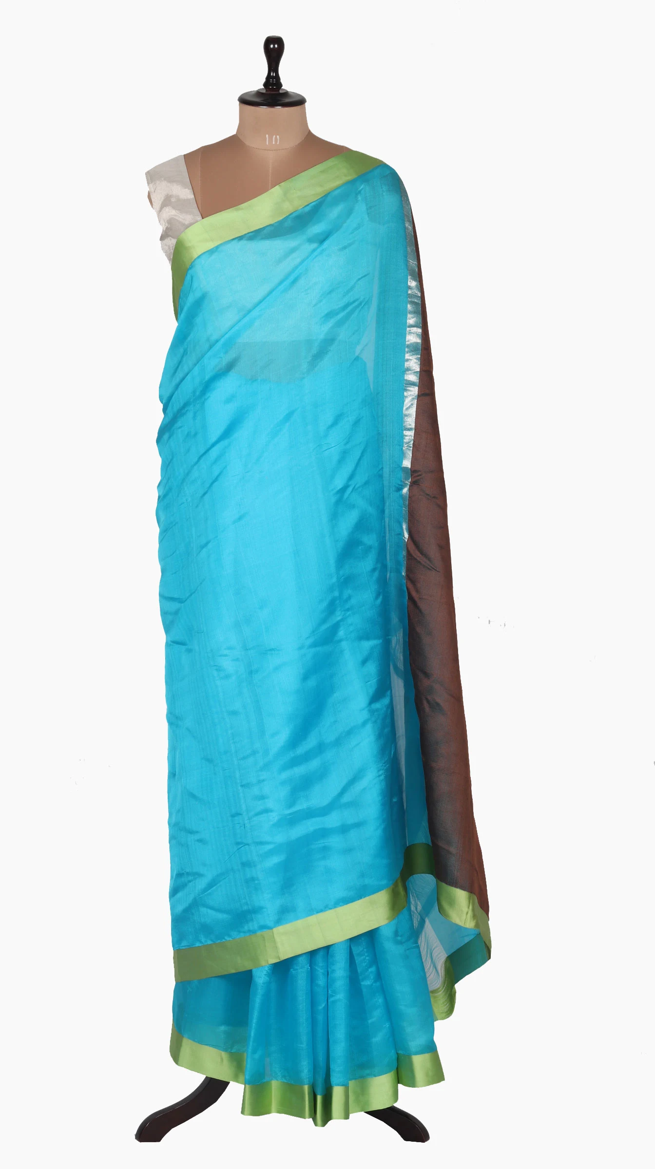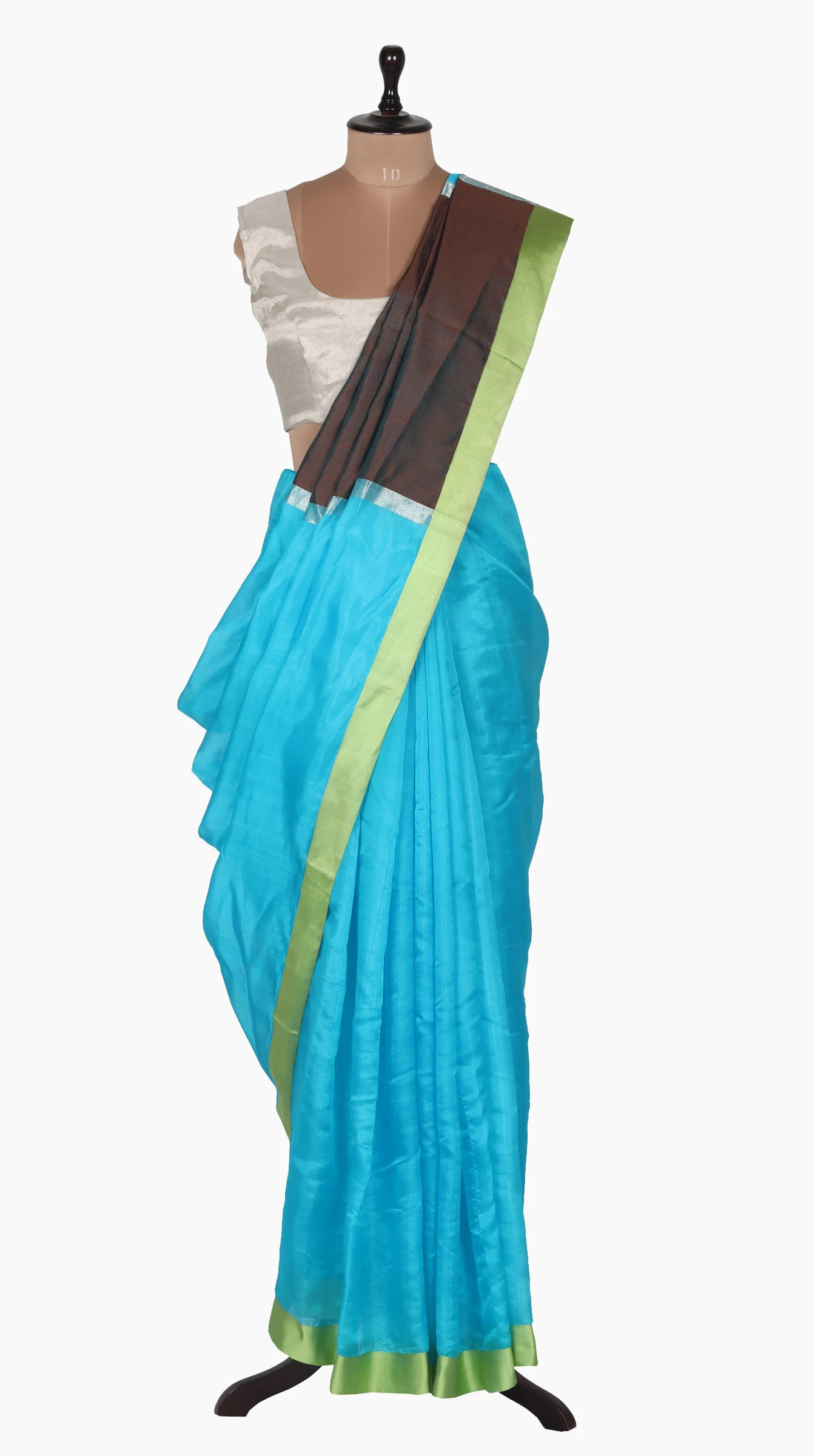 Yellow Mashru Border on both side with plain Sky Blue Chanderi Silk Saree with Contrast Coffee Taraz Weave Solid Pallu.