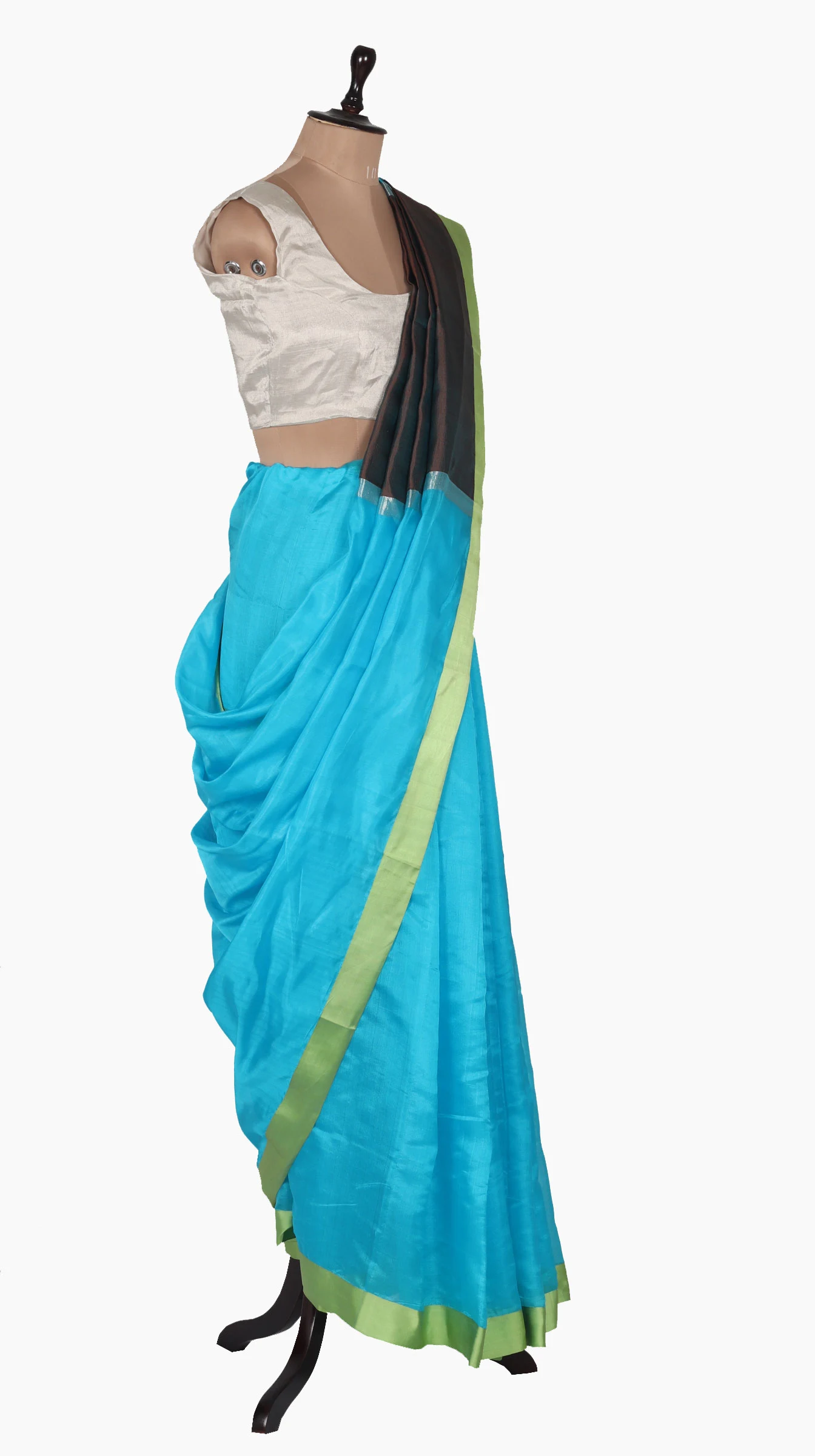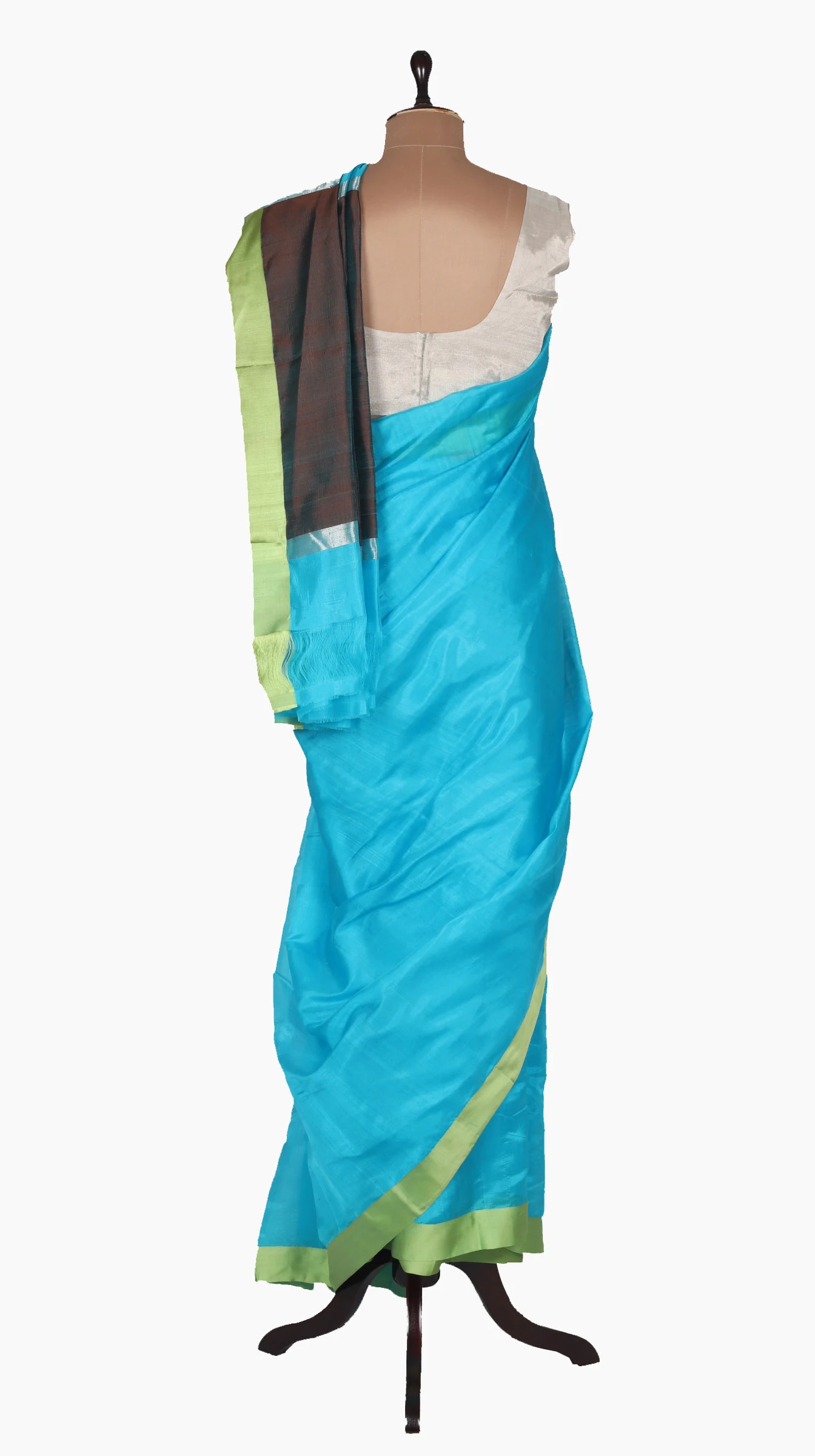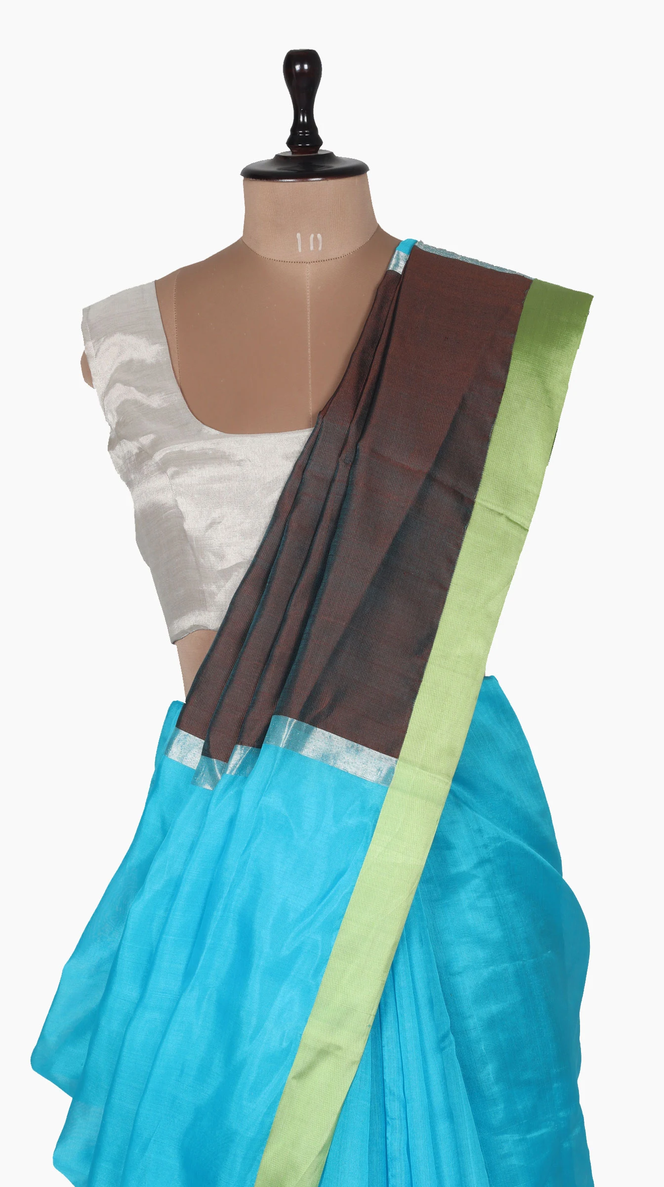 Yellow Mashru Border on both side with plain Sky Blue Chanderi Silk Saree with Contrast Coffee Taraz Weave Solid Pallu.