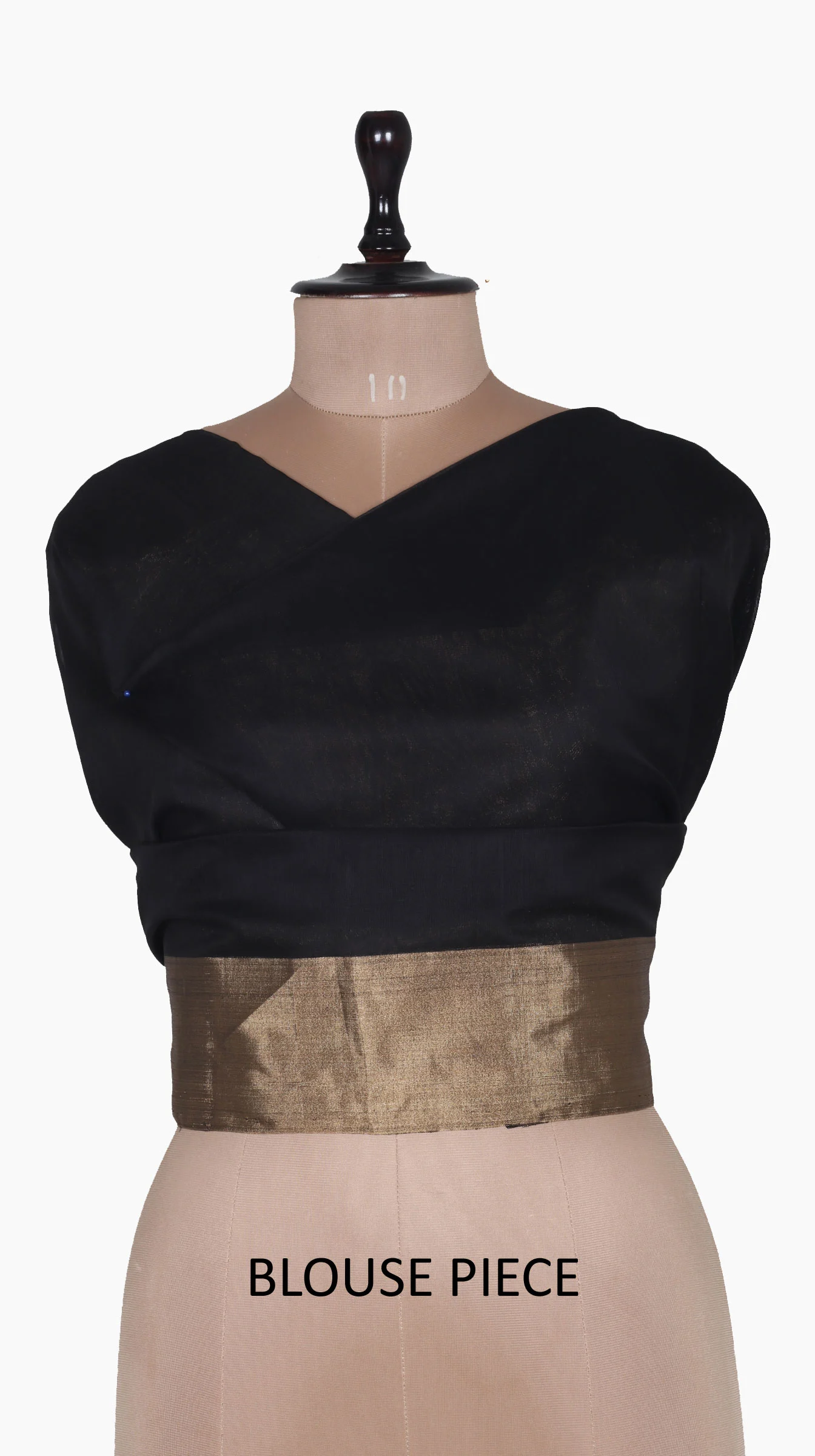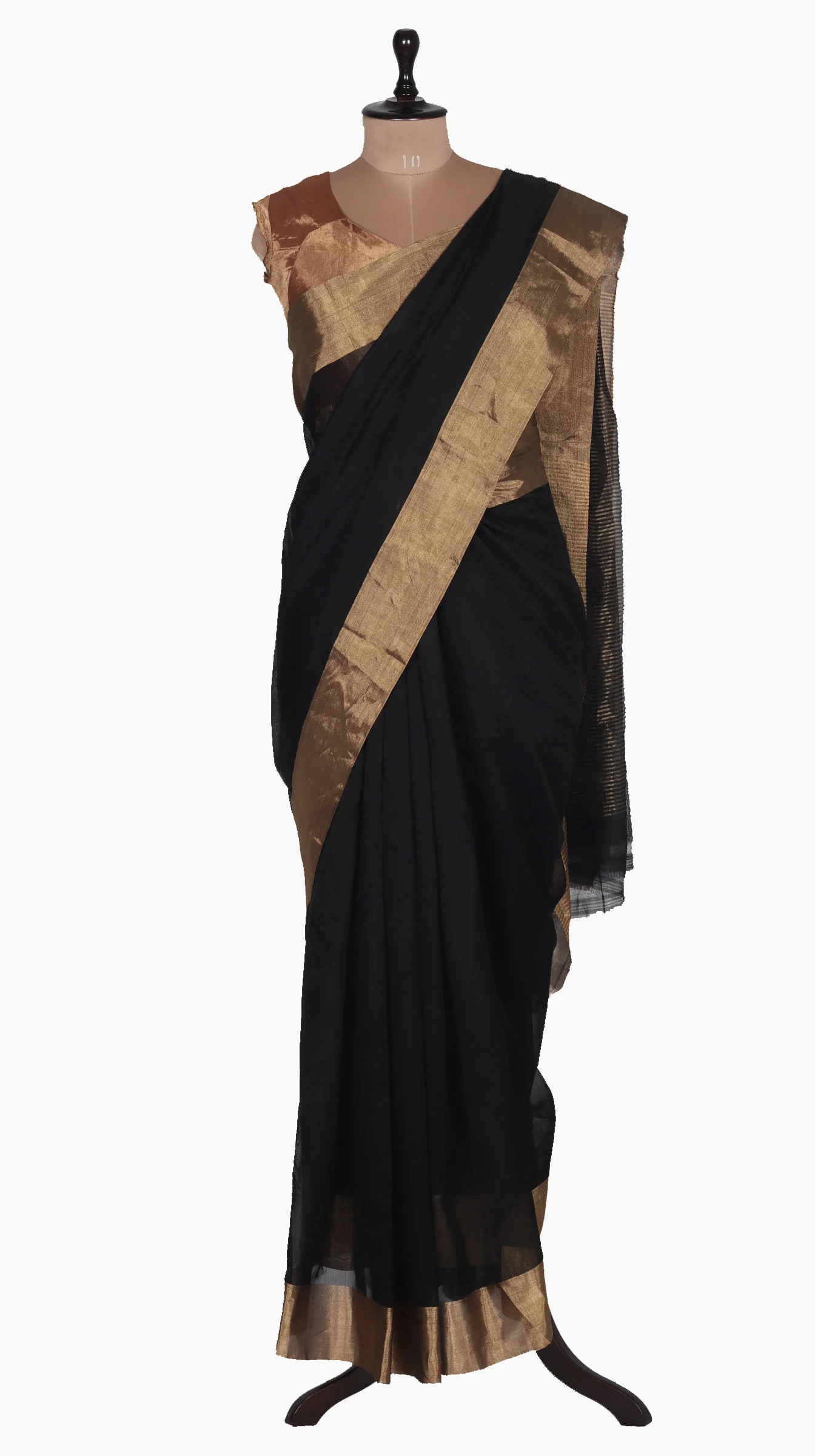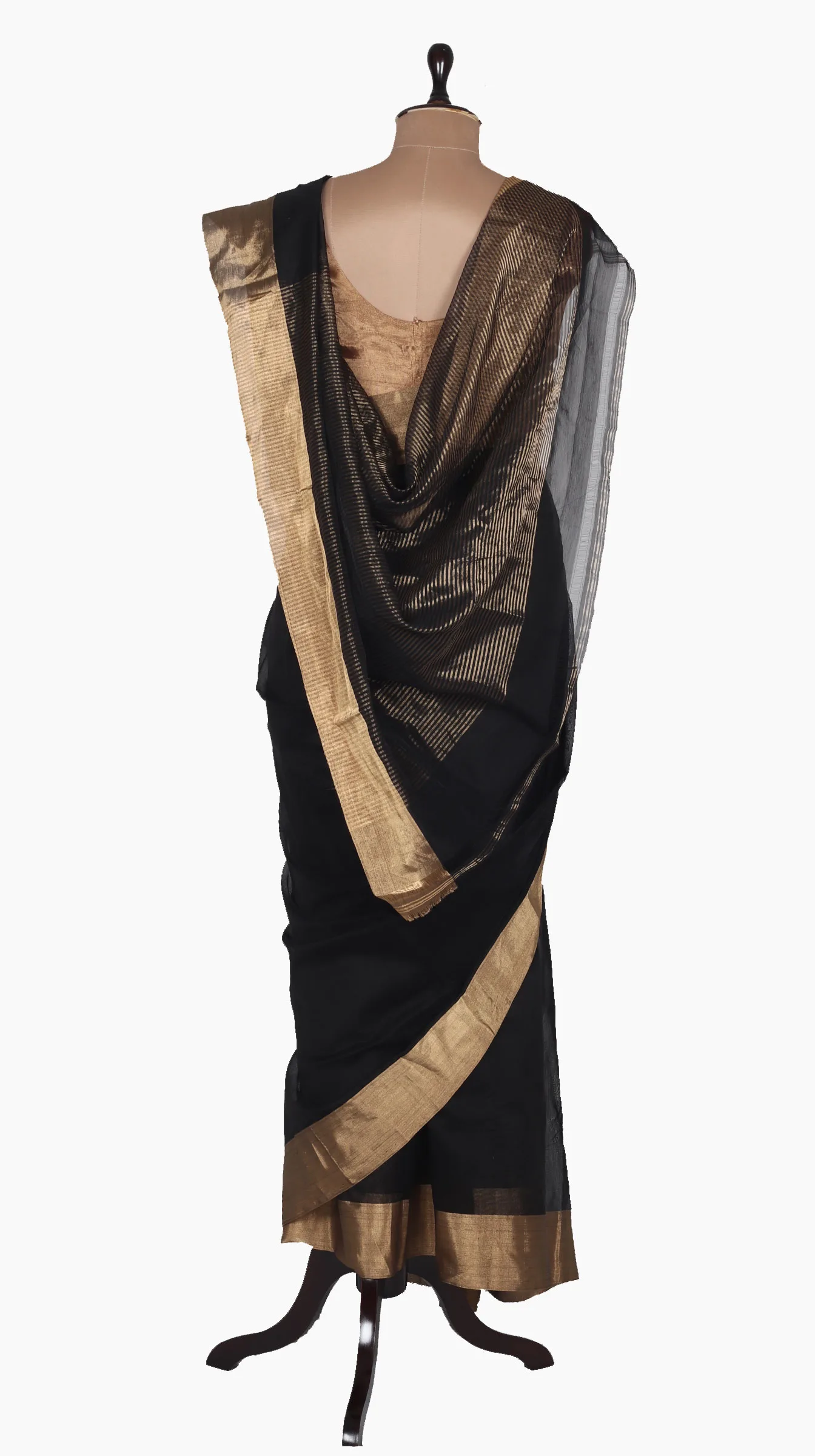 ZedBlack Plain Chanderi Silk Saree with Golden Jari stripe Pallu.